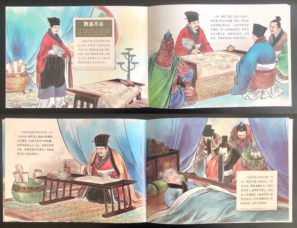 与之关联的成语「鞠躬尽瘁」中,插图再现了诸葛亮写下《出师表》的情景,孩子读起来就会很有感觉,对整个历史故事也会有更深刻的理解: