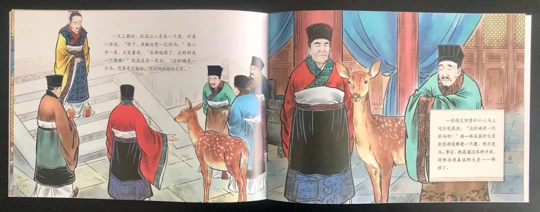 比如学习成语「指鹿为马」时,丞相赵高在朝堂上指着一只鹿说,“陛下,我给您敬献一匹好马。”