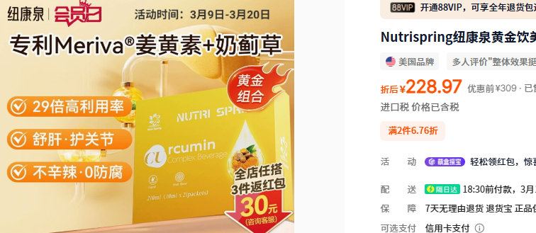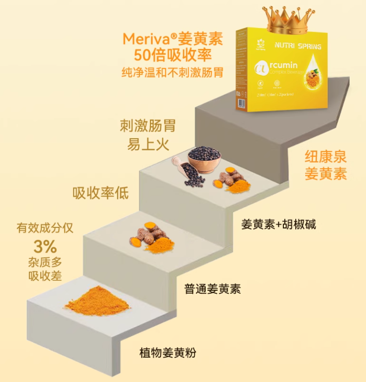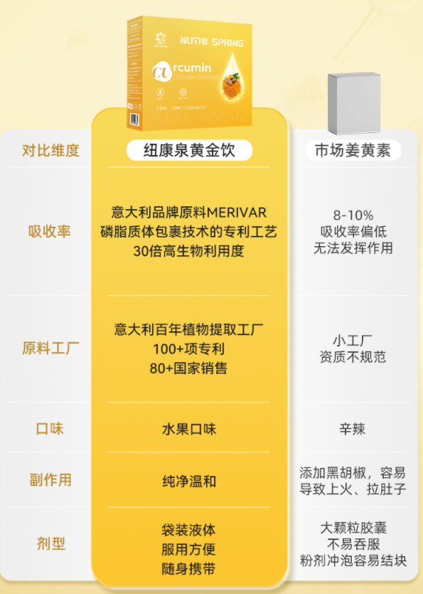 也就是说,姜黄素这东西,就是能在不改生活节奏的情况下,让你炎症情况好一些。人群持续 4 周摄入姜黄素,就能在体内显示出「抗 氧 化」反应。难怪这么多明星、超模爱把它加进食谱,做成姜黄黄金奶、姜黄面包、姜黄咖啡......我司有桥本甲状腺炎、有多囊的小姐姐,更是它的头号粉丝,一直致力安利给工作室女性同事。如果大家也很难改变生活作息,很难调整饮食,真心都推荐试试补充姜黄素!如果大家懒得用姜黄粉入菜,亦或是难以接受姜黄粉的辛辣苦味,想更高效率补充姜黄素,那推荐你们直接喝姜黄素饮。关键开袋即喝,随时随地都能喝,简单方便又高效,是所有繁忙打工人的福音啊!像我最近在喝的纽康泉姜黄素饮就很不错,其姜黄素含量、吸收率都远超同行,同时还叠加了养肝成分、养肤成分。咱就说,这种内外兼修的好东西,能不能多开发点啊!妥妥是所有爱美爱健康女生的刚需啊!✅️美白CP:高纯度烟酰胺+高浓度维E,去黄提亮养肤市面同样是高吸收率的姜黄素饮,1瓶就得去到40多50,仅仅是一瓶,且功效单一。纽康泉去炎养肝养肤,50倍高吸收率,才低至6块钱/袋!得到的养护更多,连亮白护肤品的活儿都揽下,价格却更划算!性价比这块真的拿捏的死死的!真心推荐给频繁生病、脸暗黄色斑、肝脏不好、肝火旺盛、熬夜爆痘、频繁应酬的朋友、高油高糖外卖党!现在春天正是养肝的黄金季节,肝脏就是人体的“排毒工厂”,养肝=养命,等拖到肝炎肝病再去医院,那可能就晚了。像今天纽康泉,一袋(10ml)就含有300mg姜黄素,这是安全的范围内的,也比市面很多姜黄素饮都高(100-200mg)。而且纽康泉添加的是,Meriva®专利-C3姜黄素,吸收率更好!这来自意大利100年植物提取经验的工厂,利用专利Phytosome磷脂包埋技术,促使生物利用度提高到普通C3姜黄素的29倍,达到50倍的高吸收!换言之,它不需要加黑胡椒这些提高吸收率,服用后不会产生胃部灼热感,真正做到温和不刺激、高效好吸收!安全性也不用担心,这项专利姜黄目前已拥有2000多项的人体试验,并且通过美国GRAS的安全认证。连美国克利夫兰诊所都认为,这是极好的姜黄素配方选择!目前临床记录极多的姜黄素生物制剂就是它,安全性和效果都没得说,大家尽管放心喝。除了姜黄素,它还添加了肝脏的天然守护者——水飞蓟素。它源自“天然养肝草”奶蓟草,是一种从水飞蓟种子中提取出的一种黄酮木质素类混合物,是一种强大的抗氧化剂,能帮助清 除 肝 脏 毒素,减轻肝 脏 炎 症。更厉害的是,纽康泉添加的是专利成分SILIPHOS®水飞蓟,吸收率是普通水飞蓟的5倍!生物利用度是普通奶蓟草的10倍!叠加专利姜黄素,两者双双保护肝+净化肝+促进修护肝,全方位守护肝脏健康。经常要应酬的家属,酒前喝一袋保护肝脏,还可缓解酒后不适。特别添加两大协同配方:99%高纯度烟酰胺+高含量维生素E。👉️烟酰胺,这成分相信大家都很熟悉,美白届的“扛把子”。一般这类姜黄素饮为了提高吸收率,都会添加黑胡椒粉,导致口感不好,喝完肠胃火辣辣的。纽康泉这款的,四重天然草本植萃,配料表干干净净的。适口性非常好,直接空口喝,就是清新的甜橙味,仿佛在喝一杯鲜榨橙汁,爽口愉悦。你们也可以兑水或加到牛奶中一起喝,姜黄素+牛奶,就是大名鼎鼎的姜黄黄金奶。前面也说了,市面这种含量高的姜黄素饮一般都不便宜,像这款,一盒10瓶就得400+。相比之下,纽康泉性价比别太高,1盒(10ml*21袋)官旗仅228元。强烈推荐大家直接冲2盒,价格最划算,低至6块钱一袋!姜黄素饮这么划算,大家不用怀疑,保真!有防伪码可证!