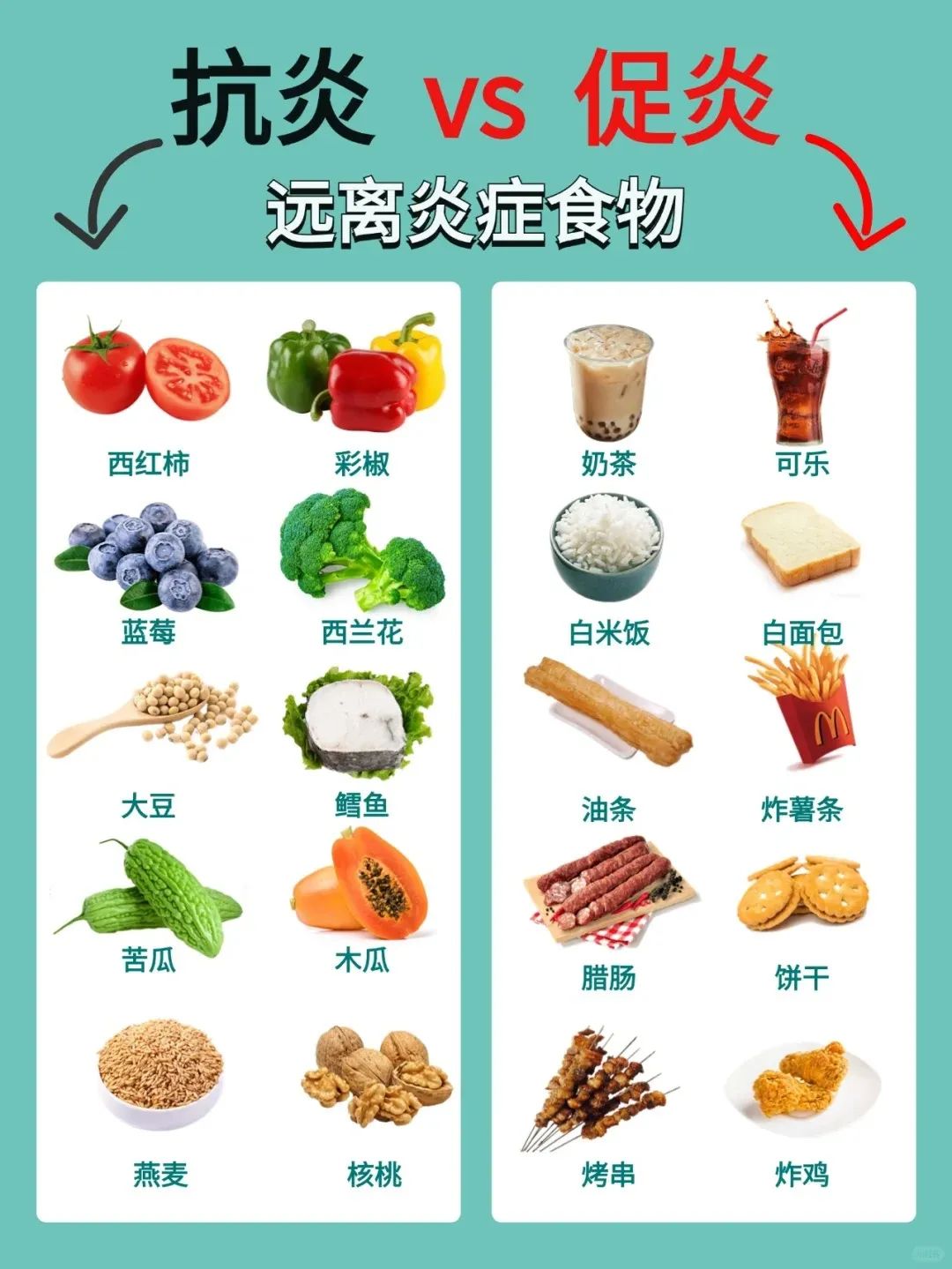 简单来说,抗炎饮食就是:少吃促炎的成分/食物,多吃抗炎的成分/食物。