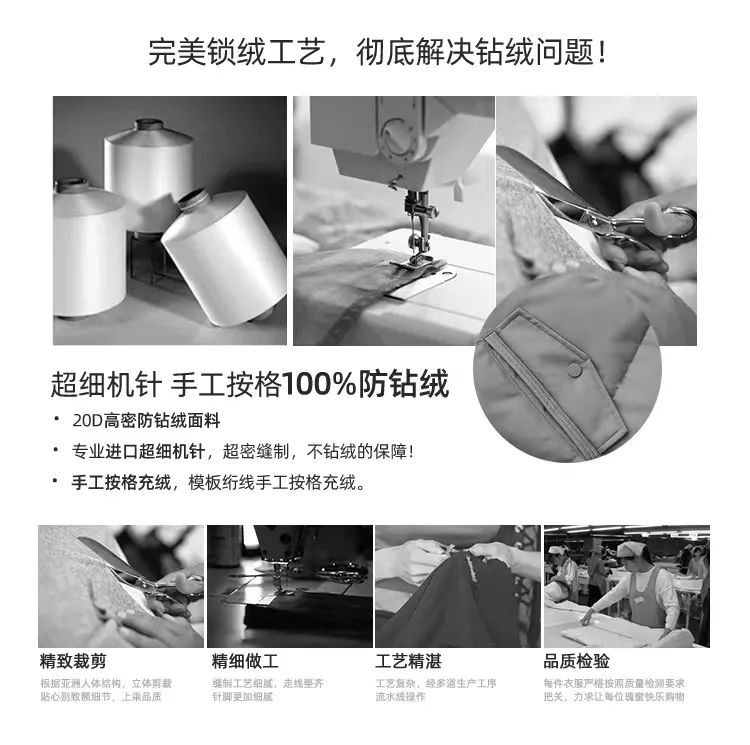 配合进口防绒针,超密集针距,再细小的羽绒都插翅难逃。