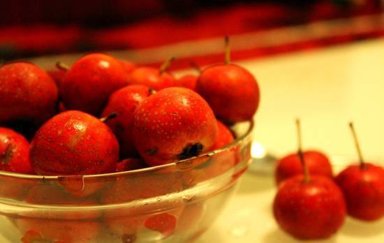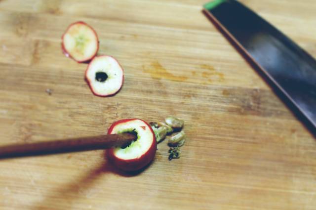 1、山楂洗净,在淡盐水中浸泡15分钟,控干水分,切去两头,用筷子的粗头去核;