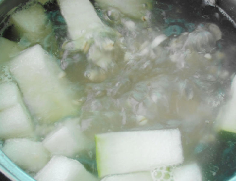 2、2个小时后放入2片姜,煮10分钟,然后放入冬瓜,煮10分钟后关火;