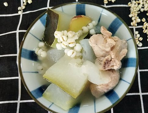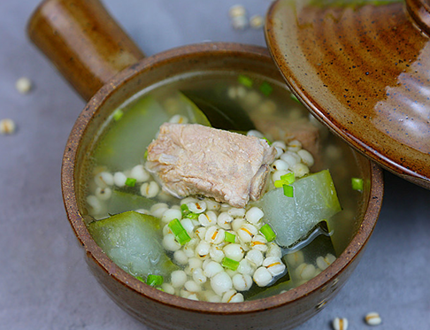 药膳讲究君、臣、佐、使,在这款汤里薏米是君,冬瓜是臣,排骨是佐,姜是使,所以这款汤一定要按比例放才能起到祛湿的功效。