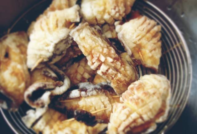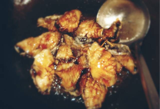 2、香菇煎炸后,定型用的牙签就可以去掉了;
