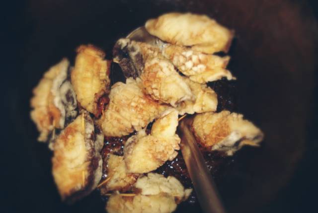 3、各种调料融合,锅中香气爆棚,回味反甜,这时候放入香菇翻炒;