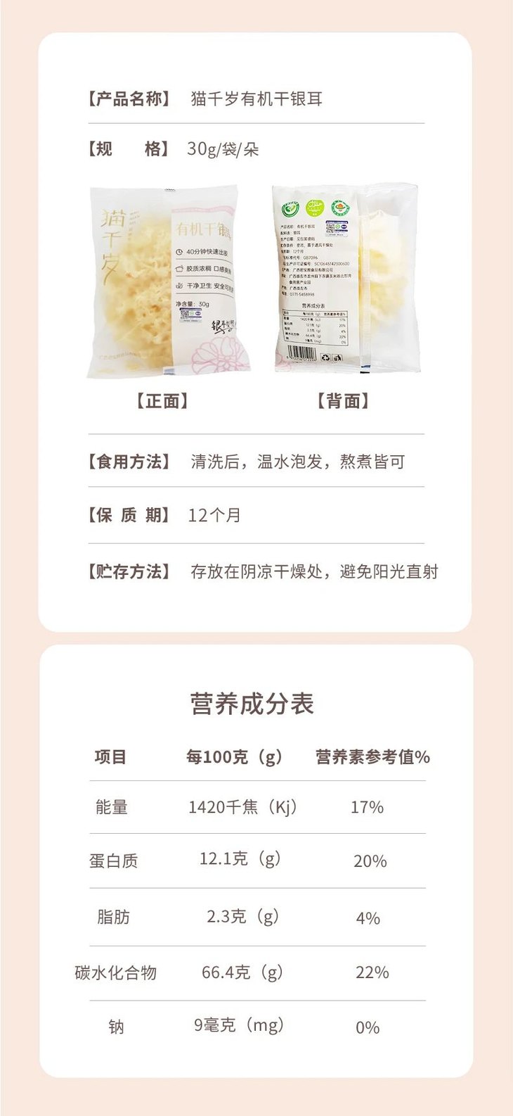 【商品名称】有机干银耳 规格:30g*6朵装