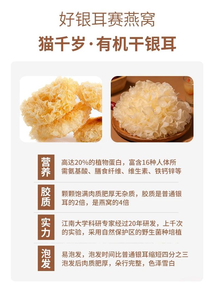 猫千岁有机银耳:16年专注银耳培植,专业团队研发有机菌棒原料,出自弄岗国家自然保护区,全程地下80米深的地下山泉水灌溉,营造25℃最适合银耳生长的环境,60天精心培植,连空气杂质都有过滤掉,才能给大家呈现出有机银耳!市场上有机银耳的价值非常高,大家可以自己查一下!
