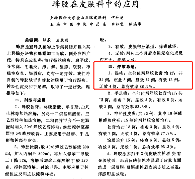 “在1990年上海医科大学金山医院皮肤科的临床应用中,用蜂胶软膏,对35例湿 疹进行使用。
