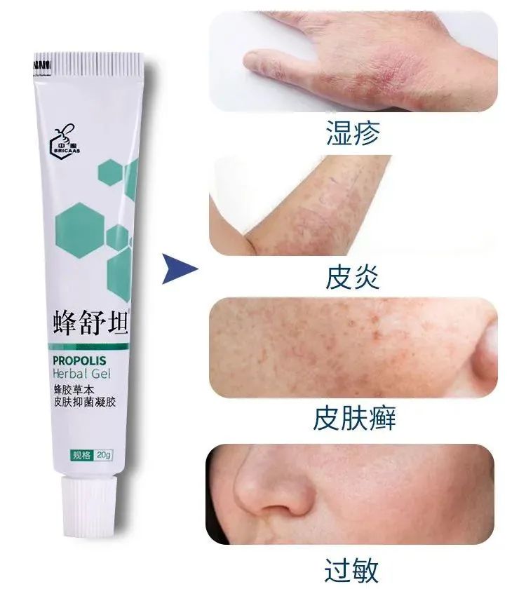 现如今,得益于科研成果和医学研究,中国中国农业科学蜜蜂研究所,研发出了这只“蜂舒坦”皮肤抑菌凝胶,专门针对皮肤问题。
