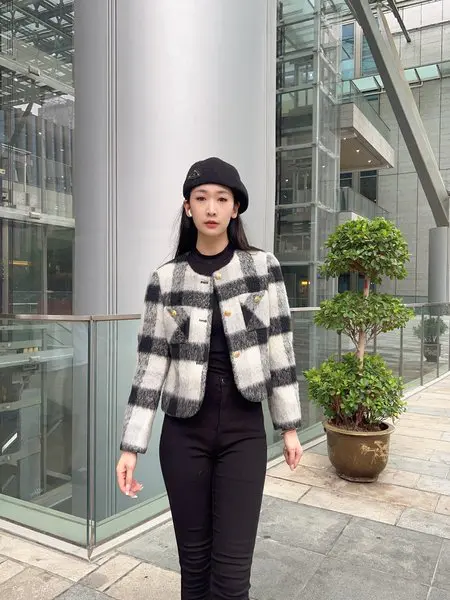 黑白格子搭配短款设计,它的正肩设计可盐可甜,而且,这件外套选用了优质的羊毛面料,穿起来非常舒适,温暖指数爆表。