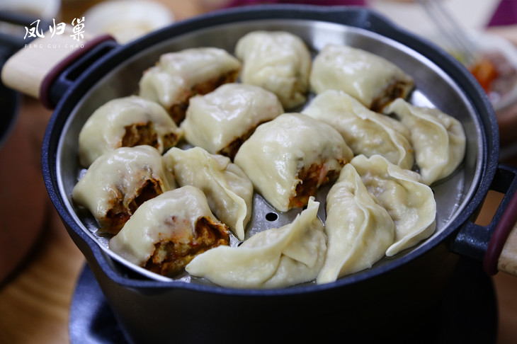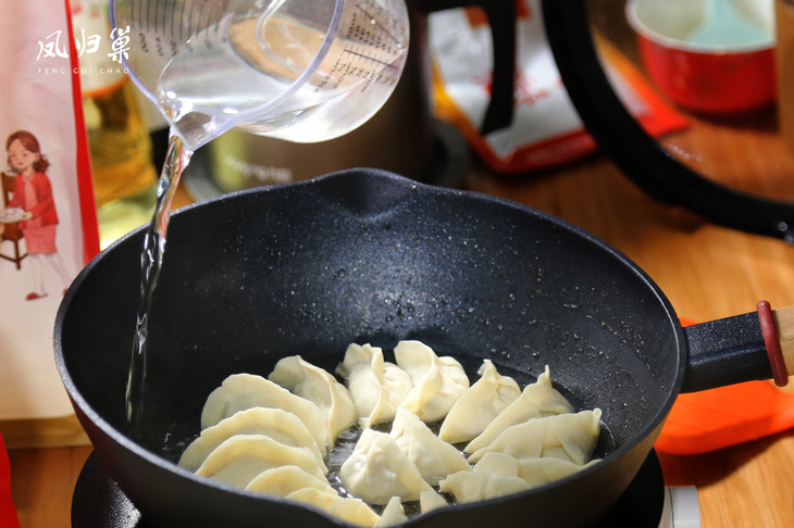 5、平底锅加热后刷油,将饺子整齐码放进去,中火将饺子底部煎制金黄后,沿着锅边加水焖至(加水量以盖住锅底一厘米为宜);