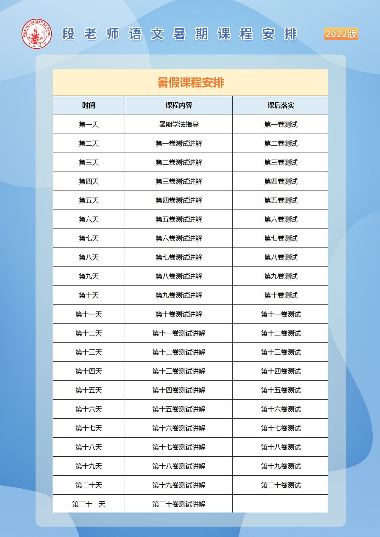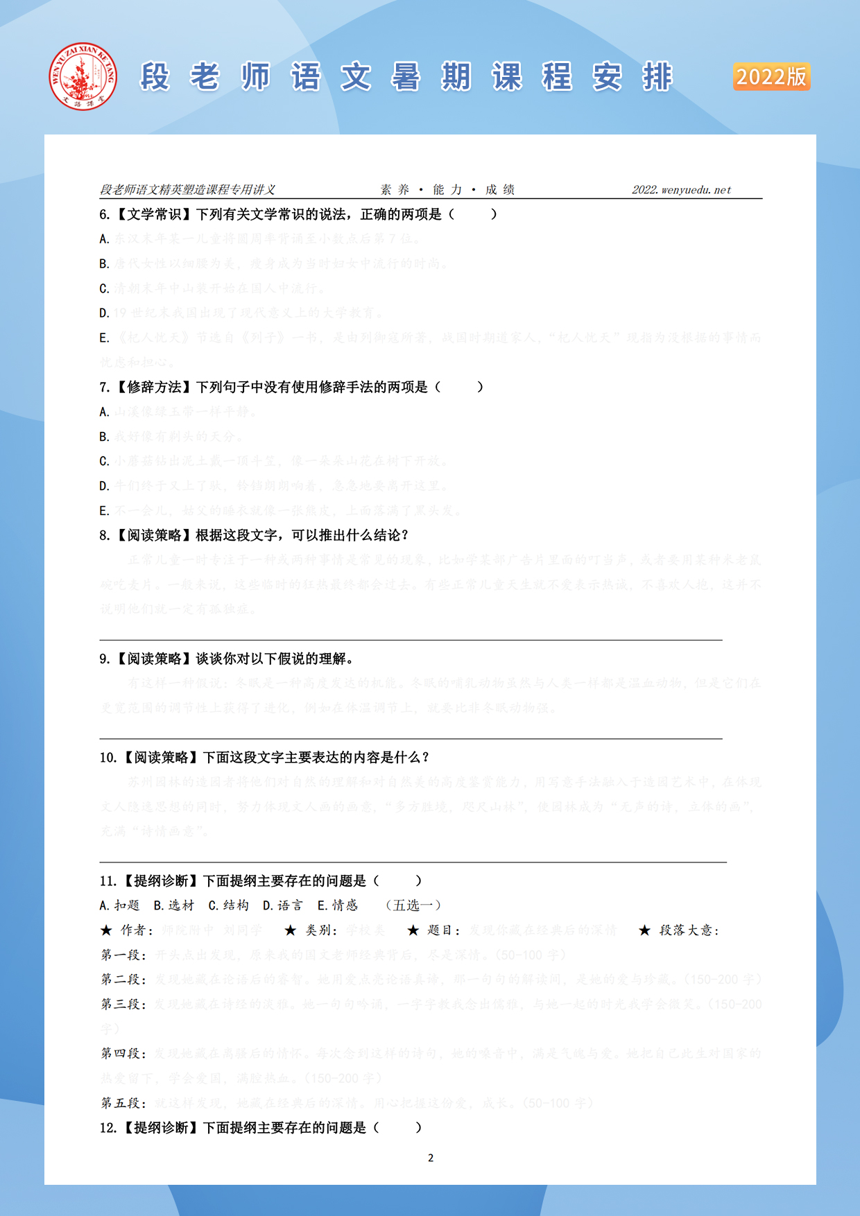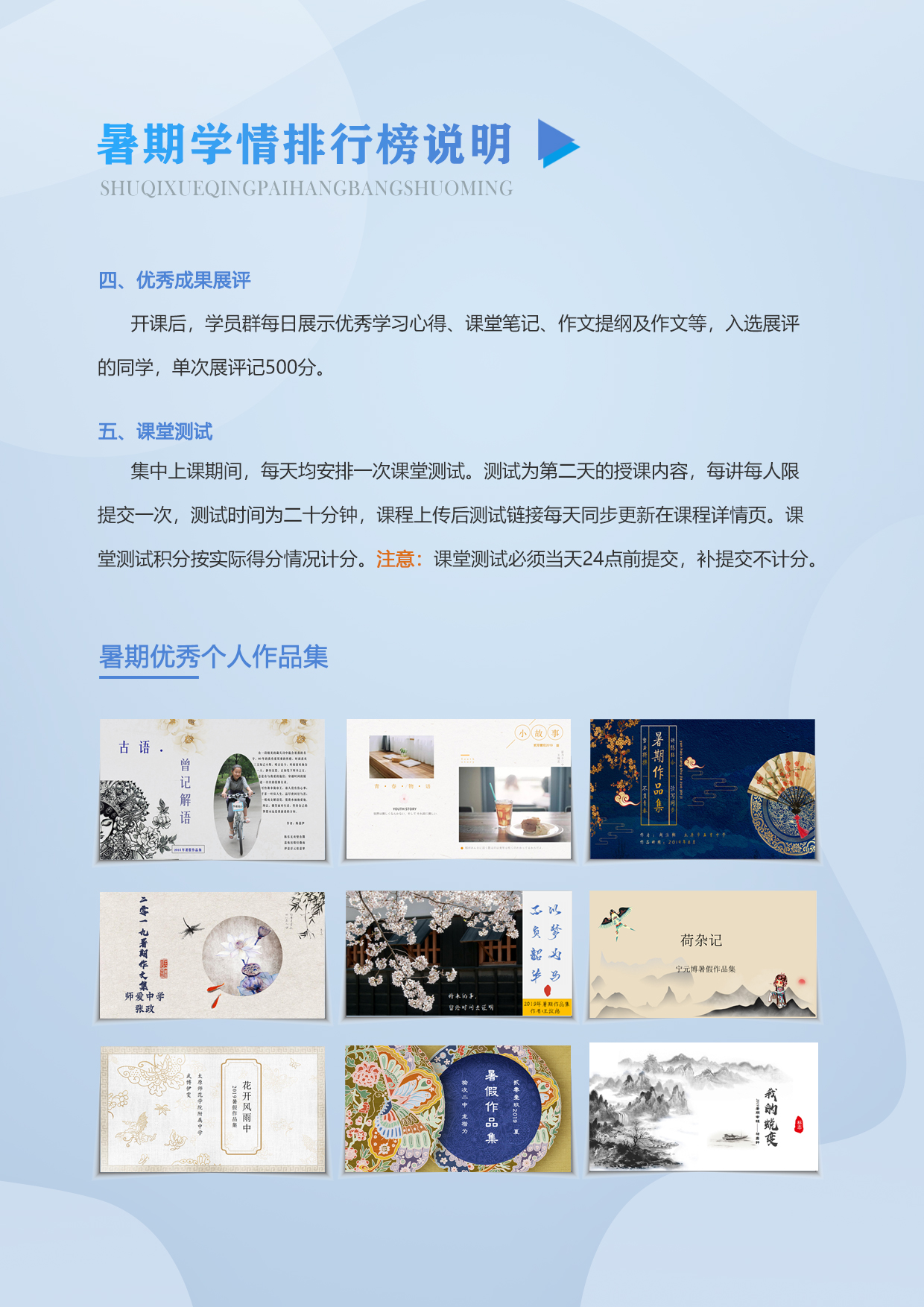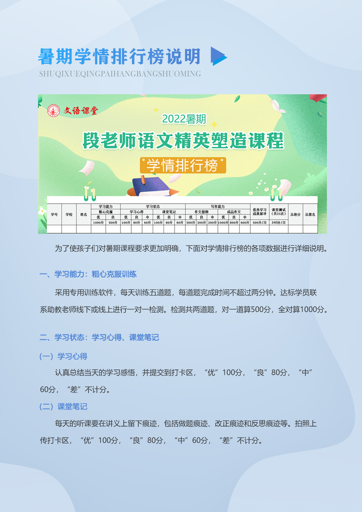 “课堂测试部分”包括基础知识(字音字形、病句修改、成语运用、标点符号、名著阅读、文学常识、修辞方法)、阅读策略、提纲诊断三大部分。每份讲义包括12道选择题,每题20分。今天做,明天讲。学习心得、课堂笔记要求拍照上传打卡区(打卡链接开课前发在各班级群);测试分数计入学情排行榜;