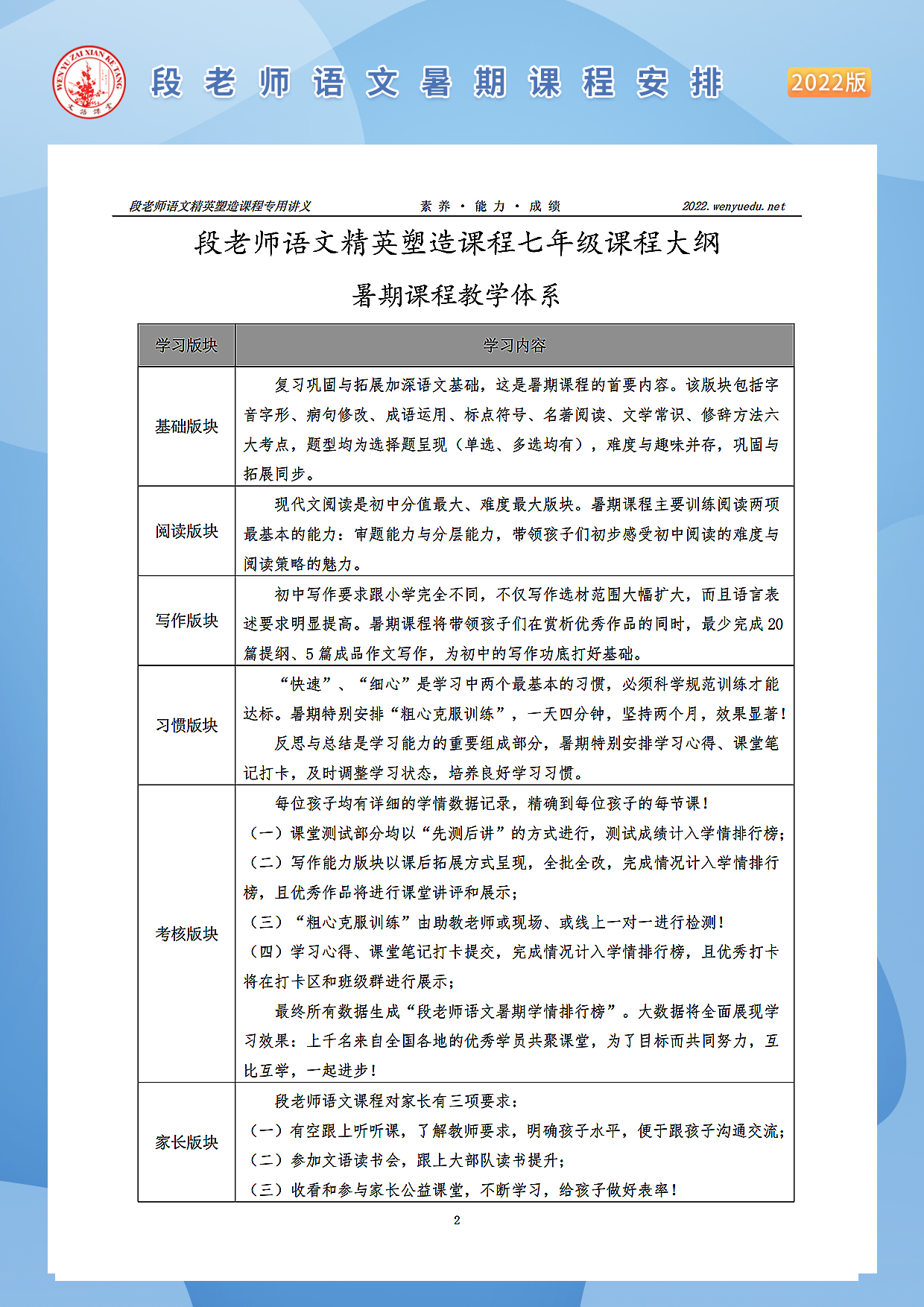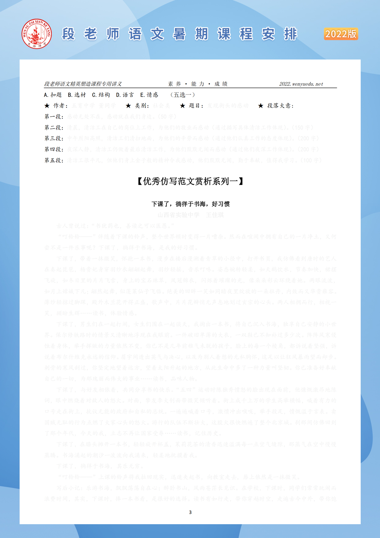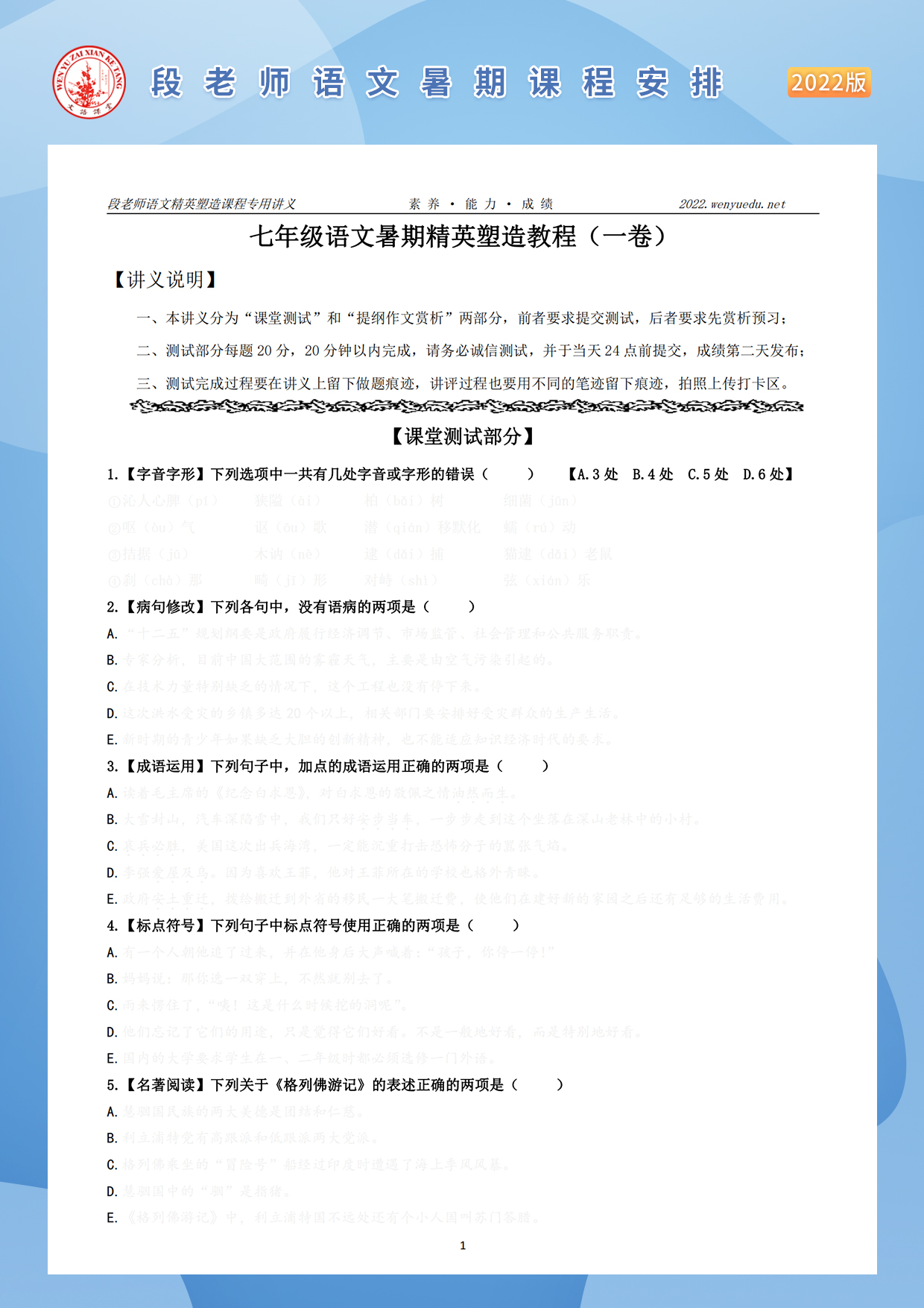 七年级暑期课程第一讲为学法指导,后面的每讲学习内容均包括“课堂测试部分”和“优秀仿写范文赏析”两大部分。