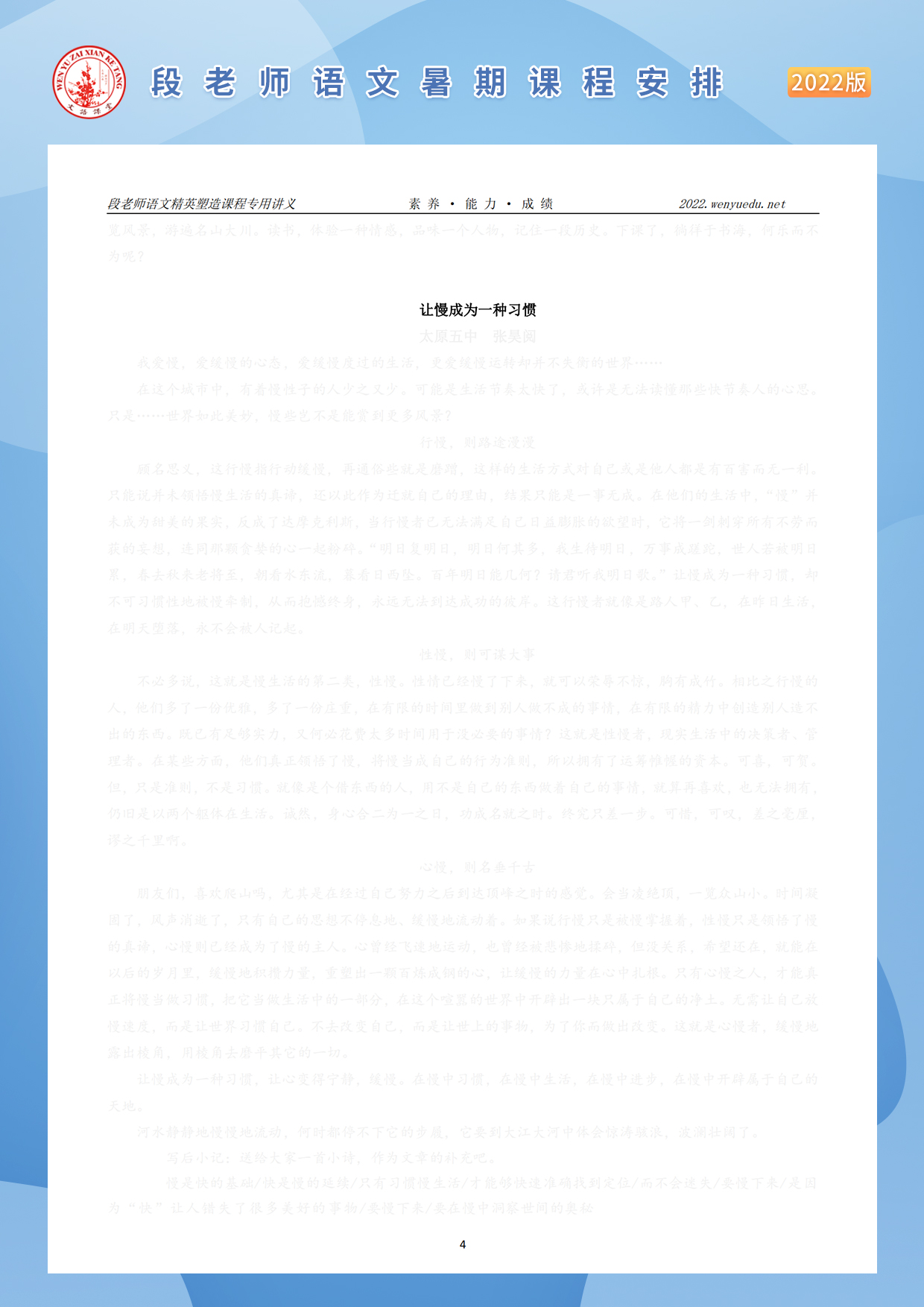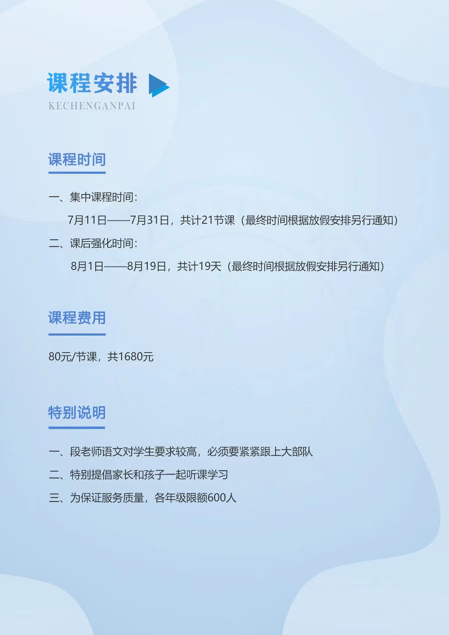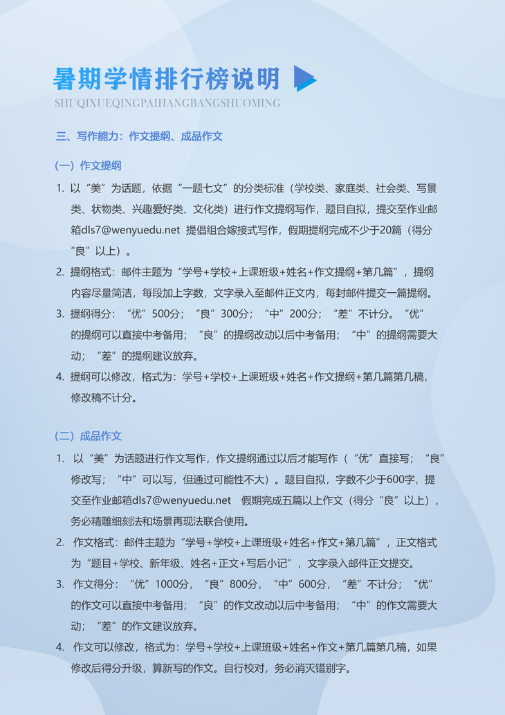 七年级暑期课程第一讲为学法指导,后面的每讲学习内容均包括“课堂测试部分”和“优秀仿写范文赏析”两大部分。