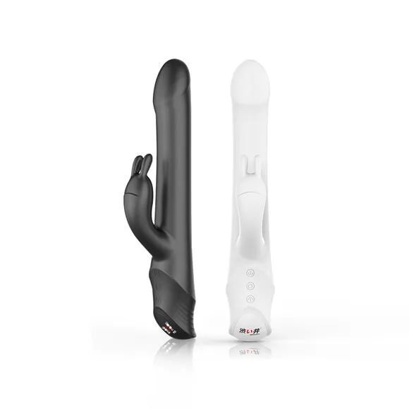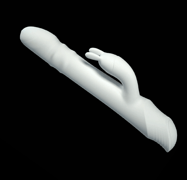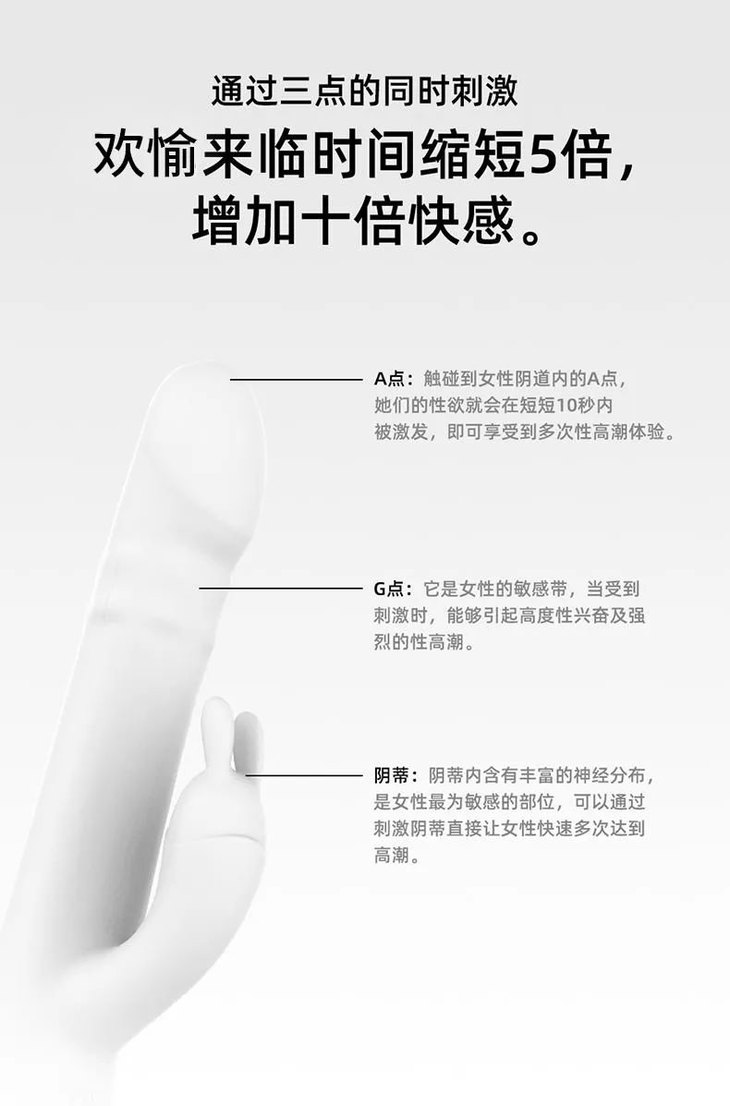 而开启开关后,它的强大功能就呈现出来了。大头在上下抽动的同时,中段有两排转珠在同时旋转,再加上兔头的强烈震动刺激,可以同时刺激女生的A点(大头顶部挤压刺激)、G点(转珠摩擦V道壁)、C点(兔头震动刺激豆豆),想想就好爽啊~!