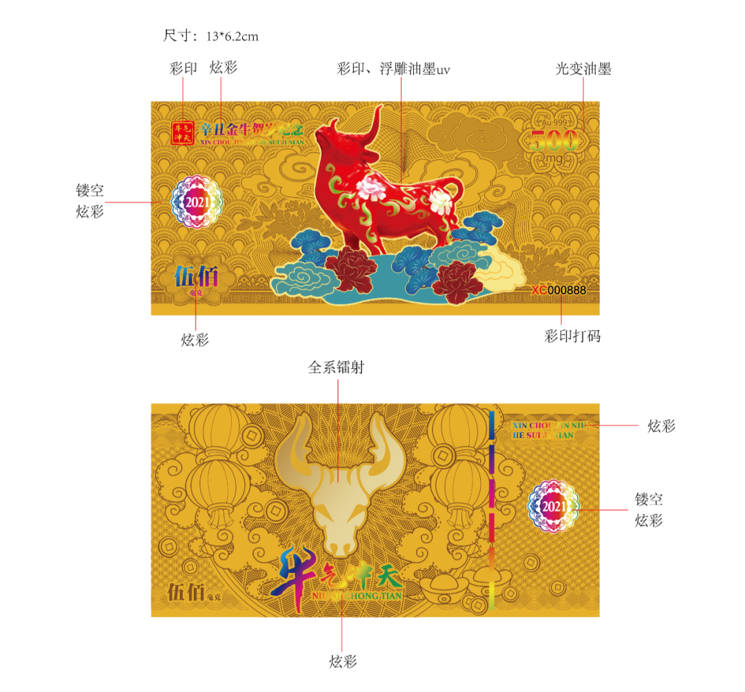 而今天为大家带来的“牛气冲天”纪念金,还融入了四色炫彩、镂空炫彩、彩印等多种工艺,更具艺术鉴赏性。
