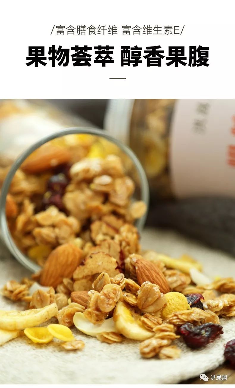 麦片是很多健身朋友都在推荐的代餐或者零食,但是洪姐给你提个醒,可别挑花了眼。很多加工后的燕麦其实糖分以及热量都很高,所以需要擦亮眼睛。洪姐给大家推荐一款我们洪晟翔的即食坚果燕麦片,热量低,富含膳食纤维和维生素E。
