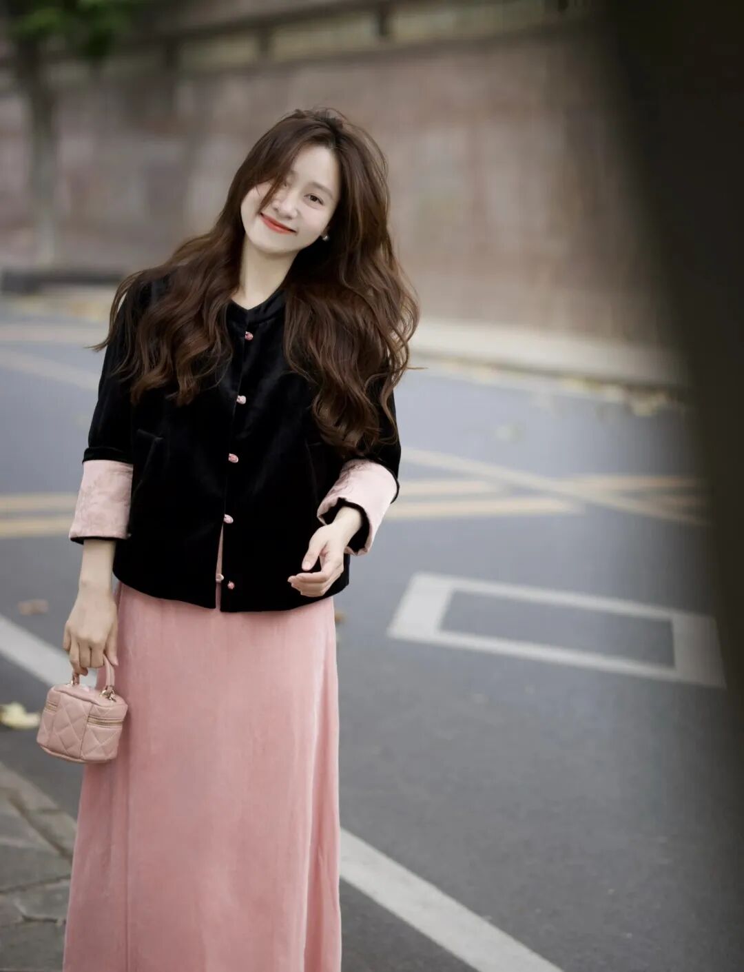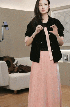 下半身搭配的半裙选择和袖子颜色相呼应的芝芝莓莓粉,黑粉搭配太绝了,甜而不嗲,中和了上半身的严肃感,一下子变得亮眼起来,整个人都明媚了许多。