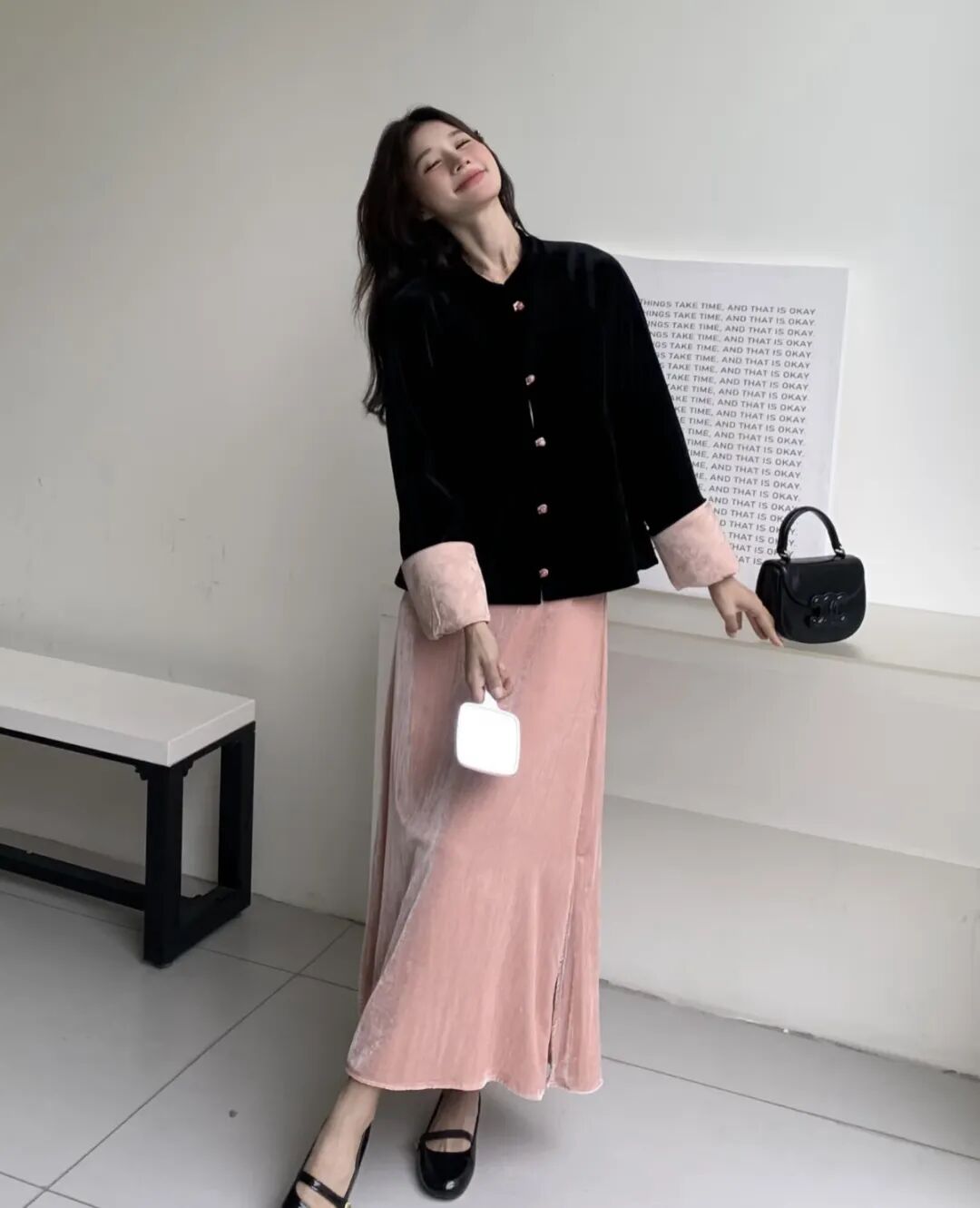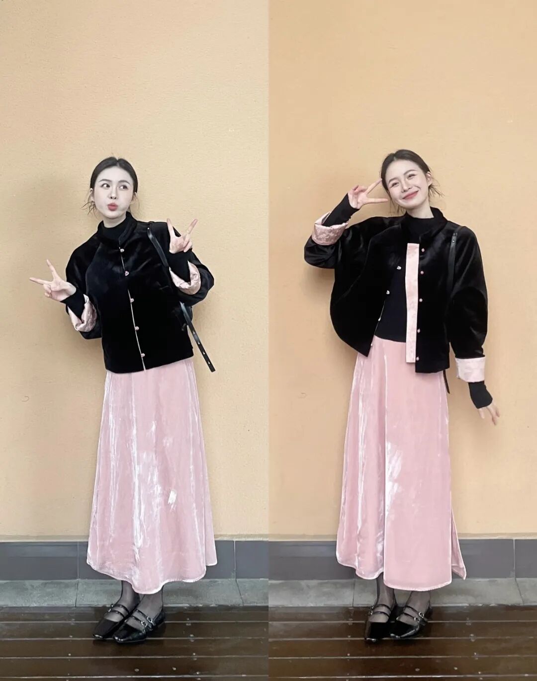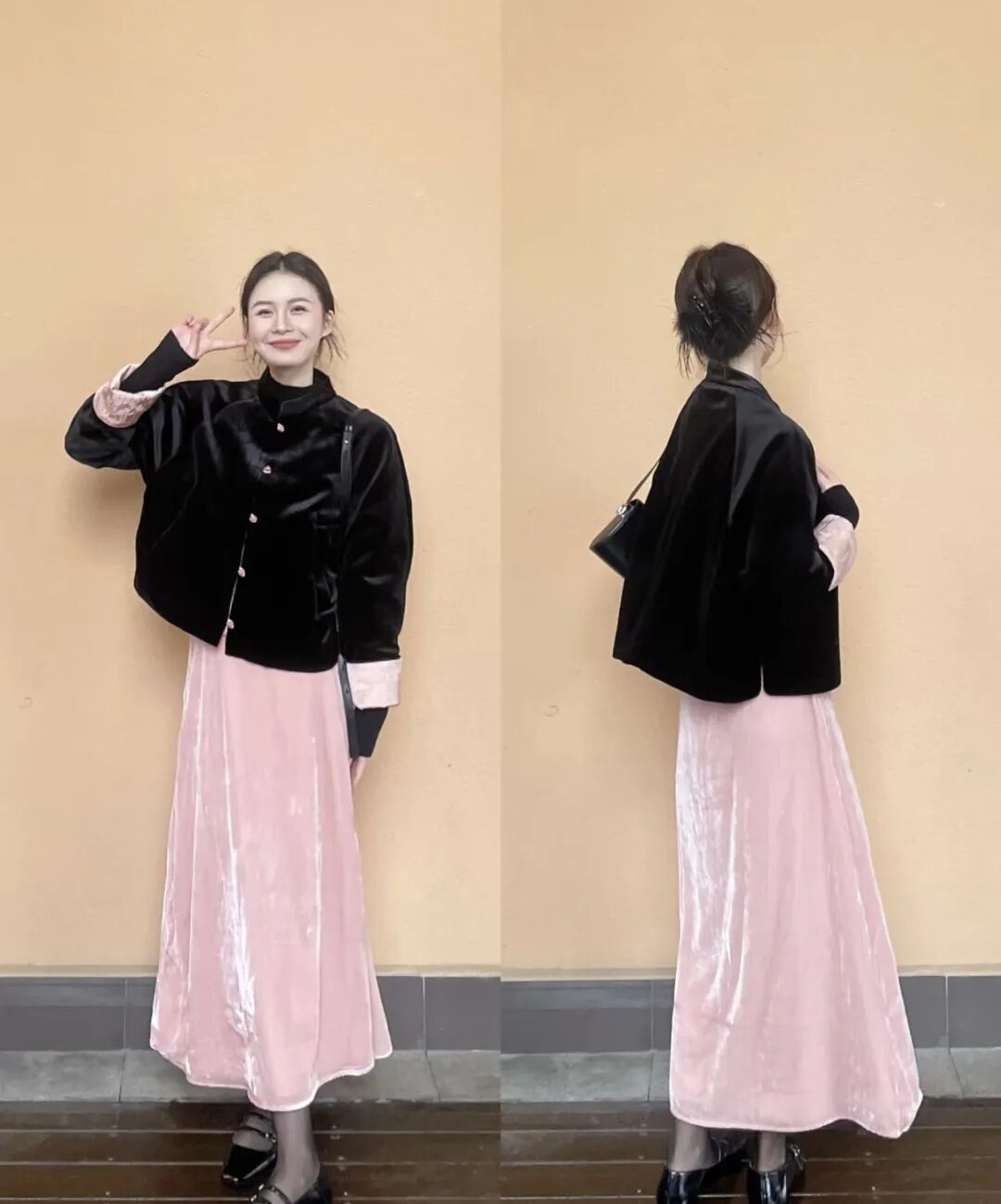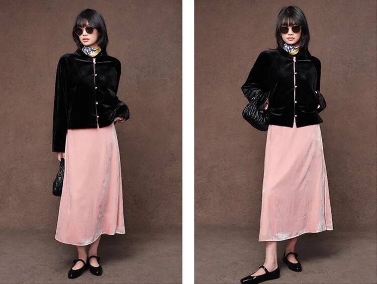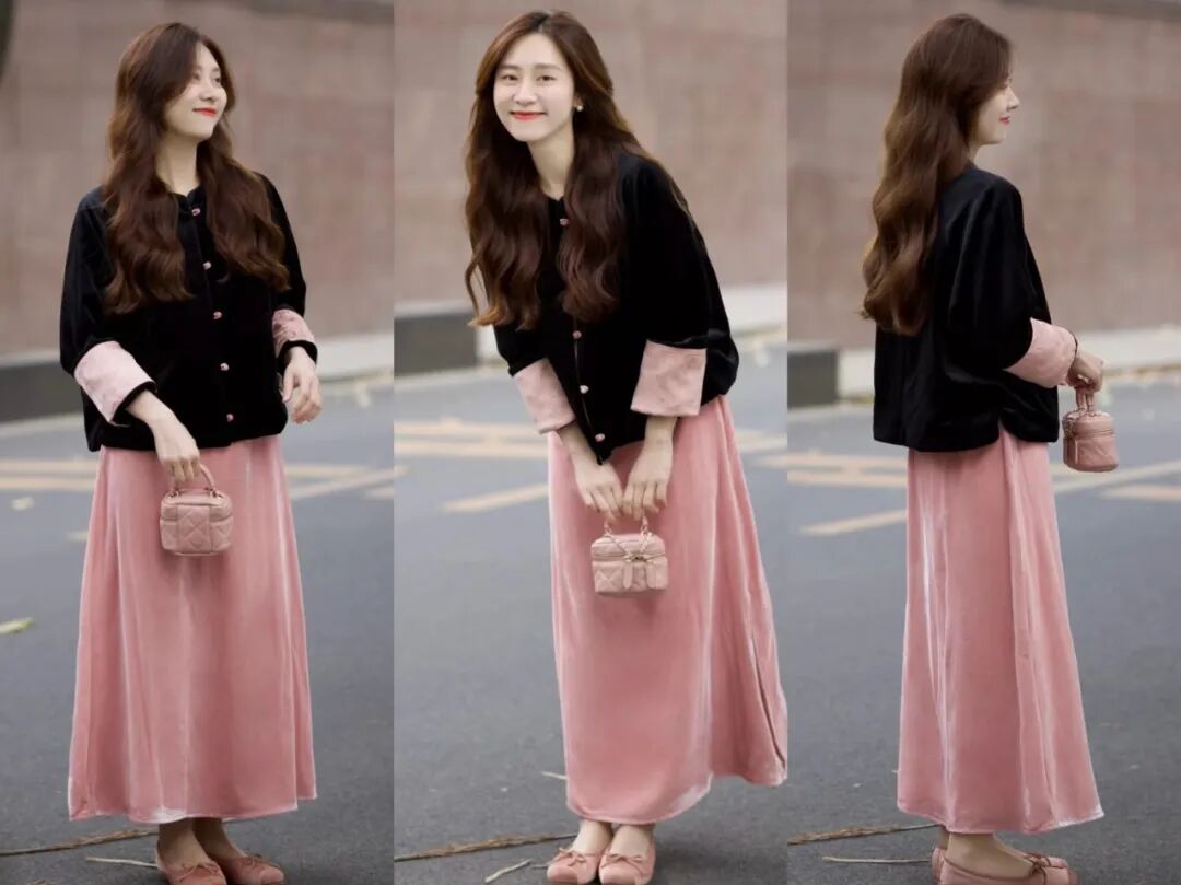 想要更精致的造型?搭配一条丝绒半裙,整体顺色,优雅大方,气质直接拉满。或者,大胆搭配粉色流光丝绒半裙,上下呼应,温柔又吸睛。