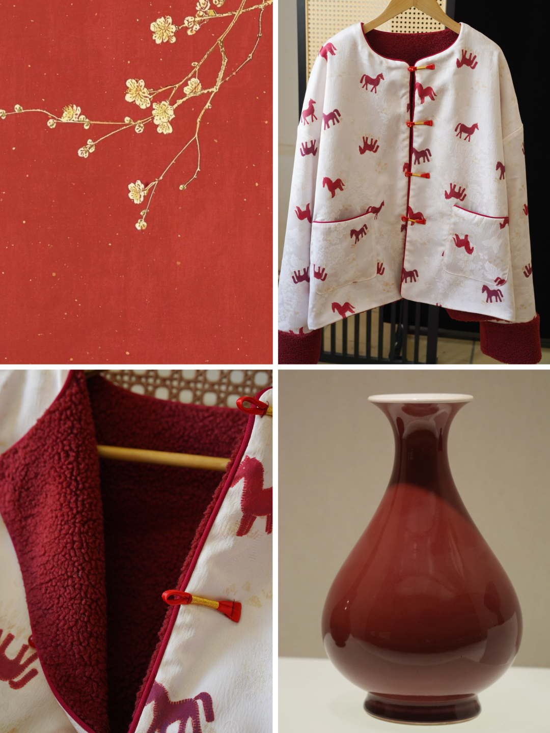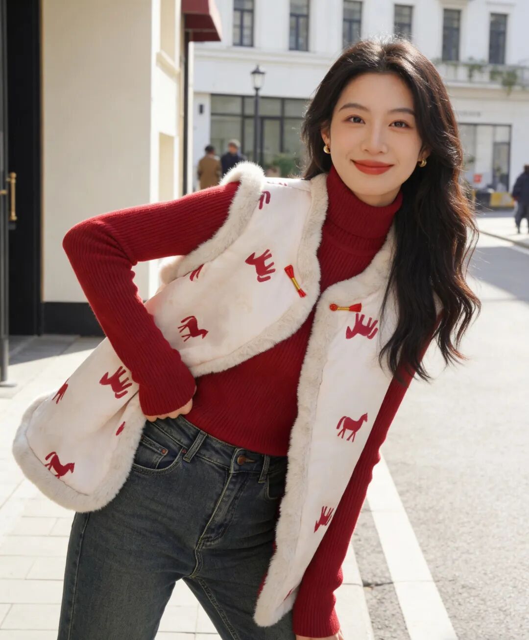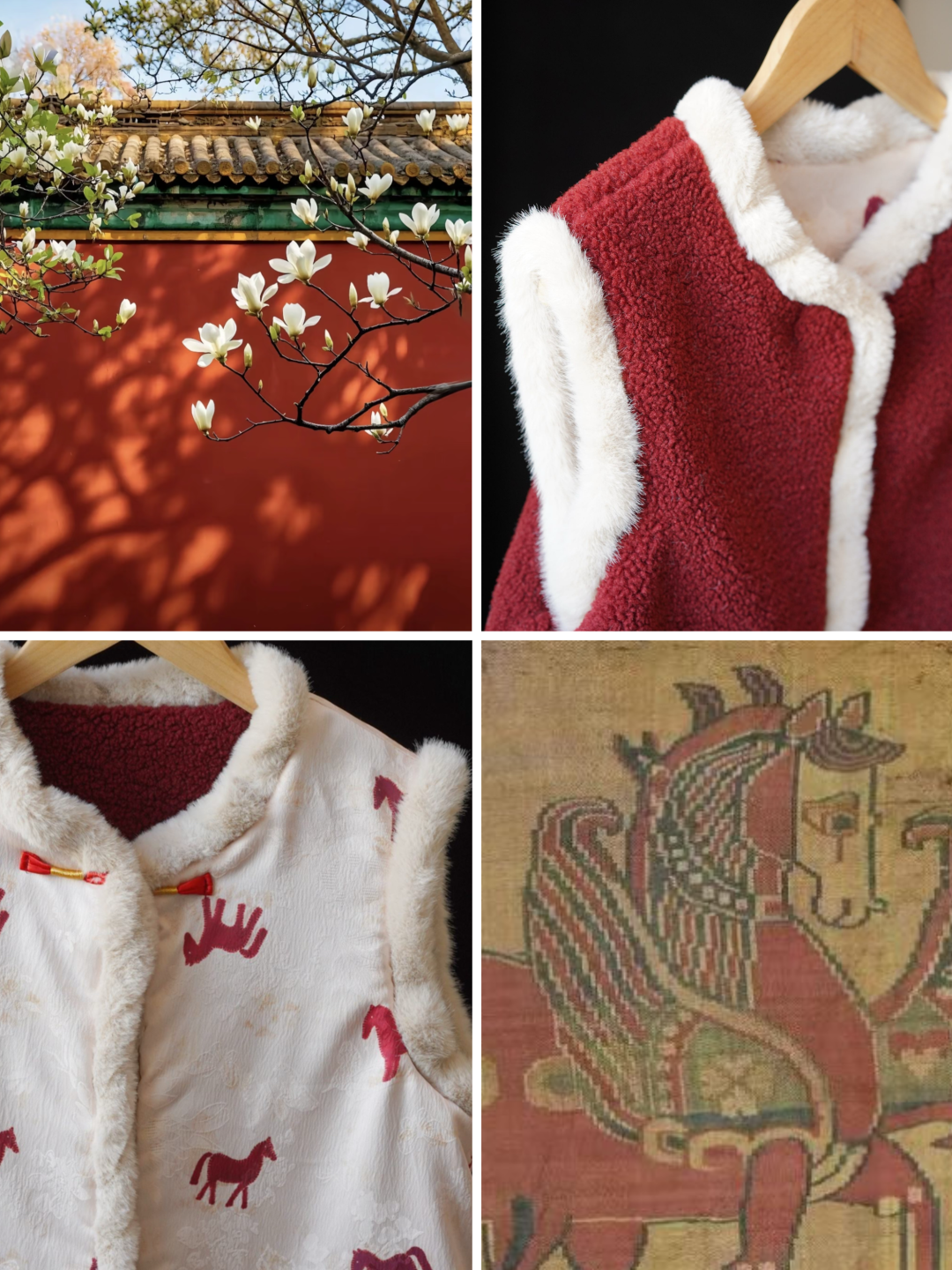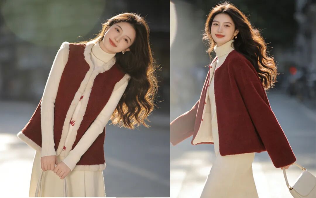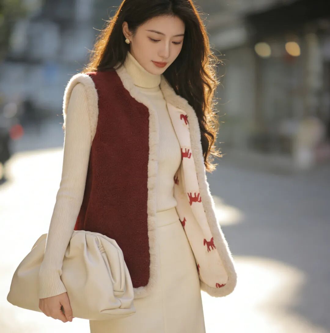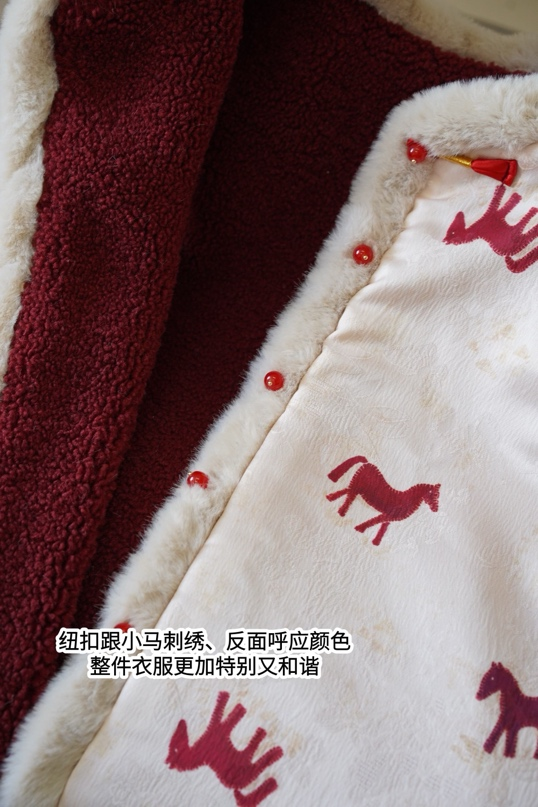 骐骥红小马,搭配中式留白,扑面而来东方高级感;骐骥红羊羔绒,柔绒暖意,红火热烈巨显白。