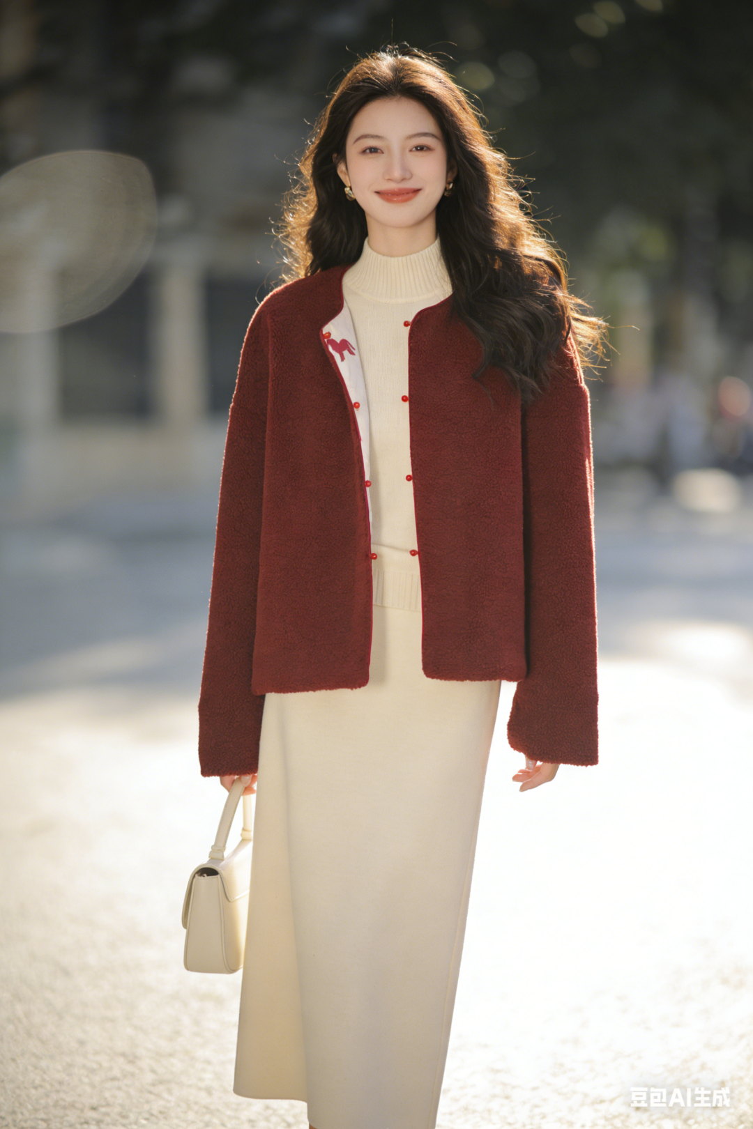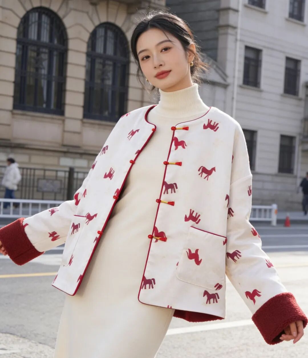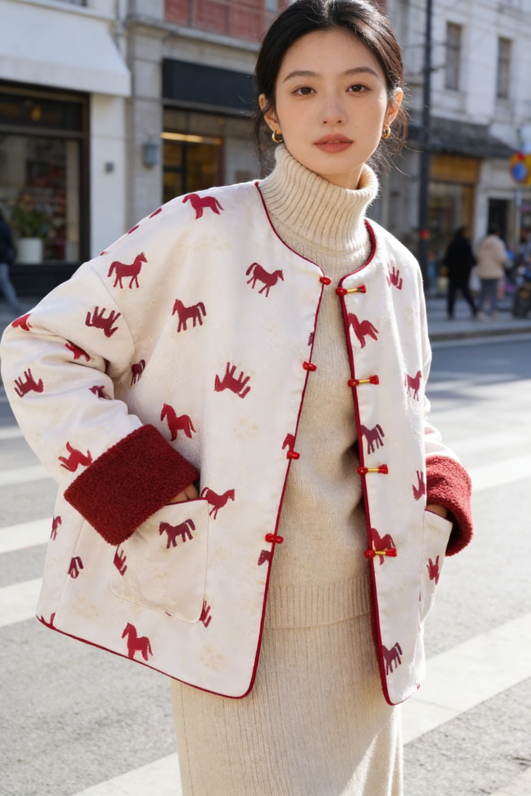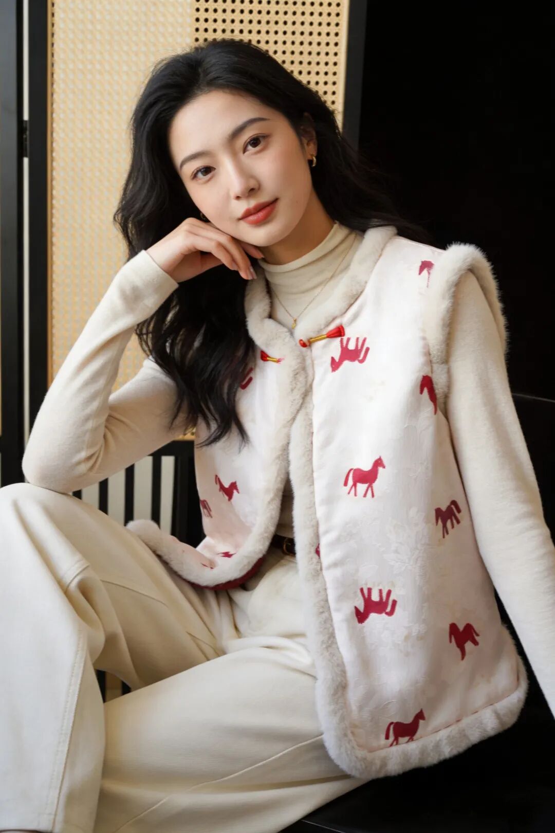 骐骥红小马,搭配中式留白,扑面而来东方高级感;骐骥红羊羔绒,柔绒暖意,红火热烈巨显白。