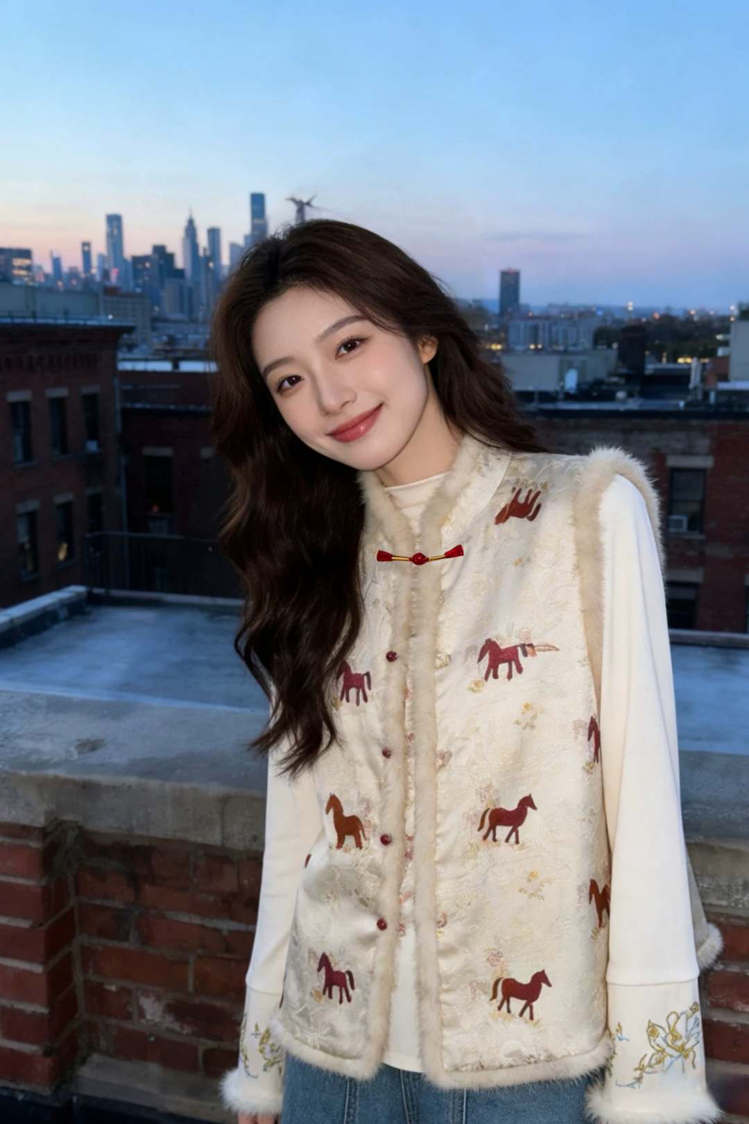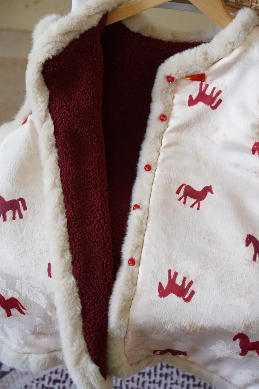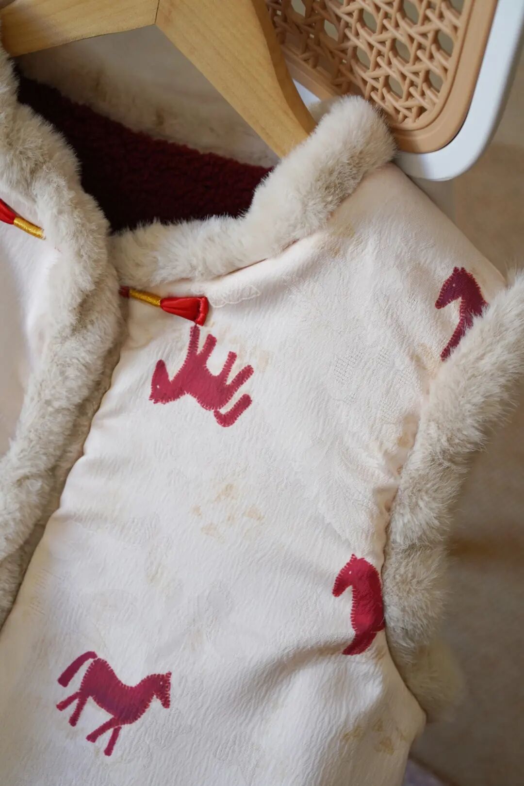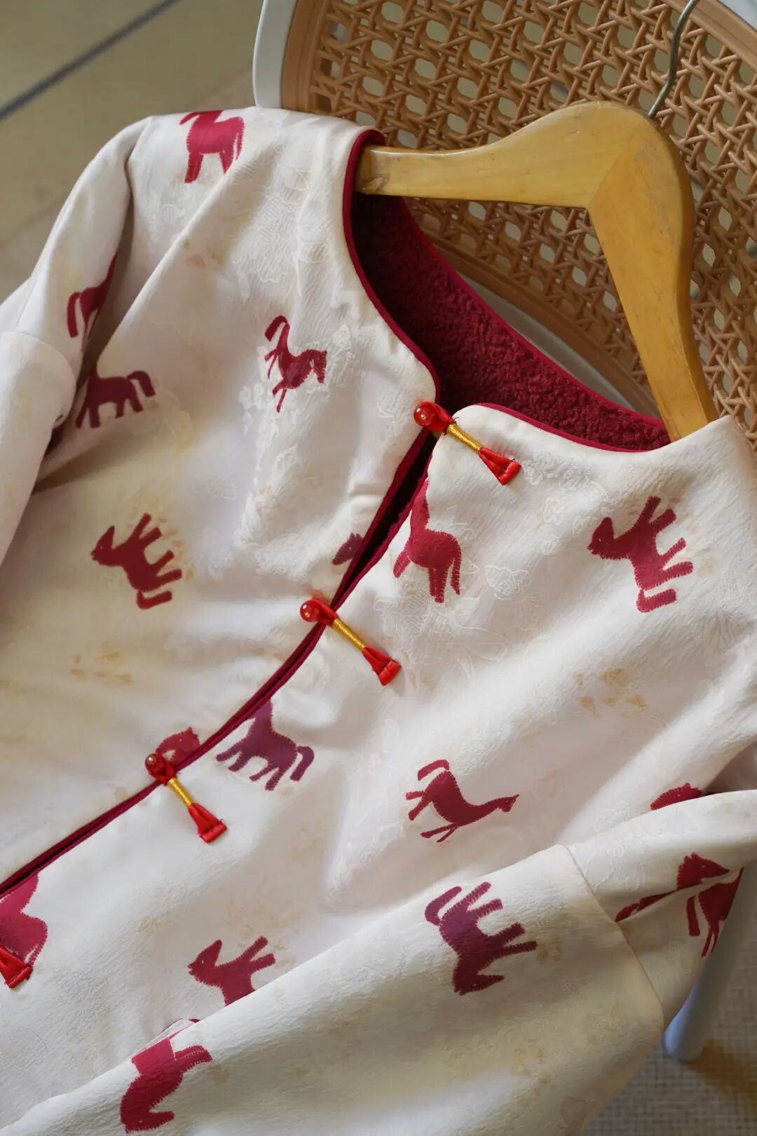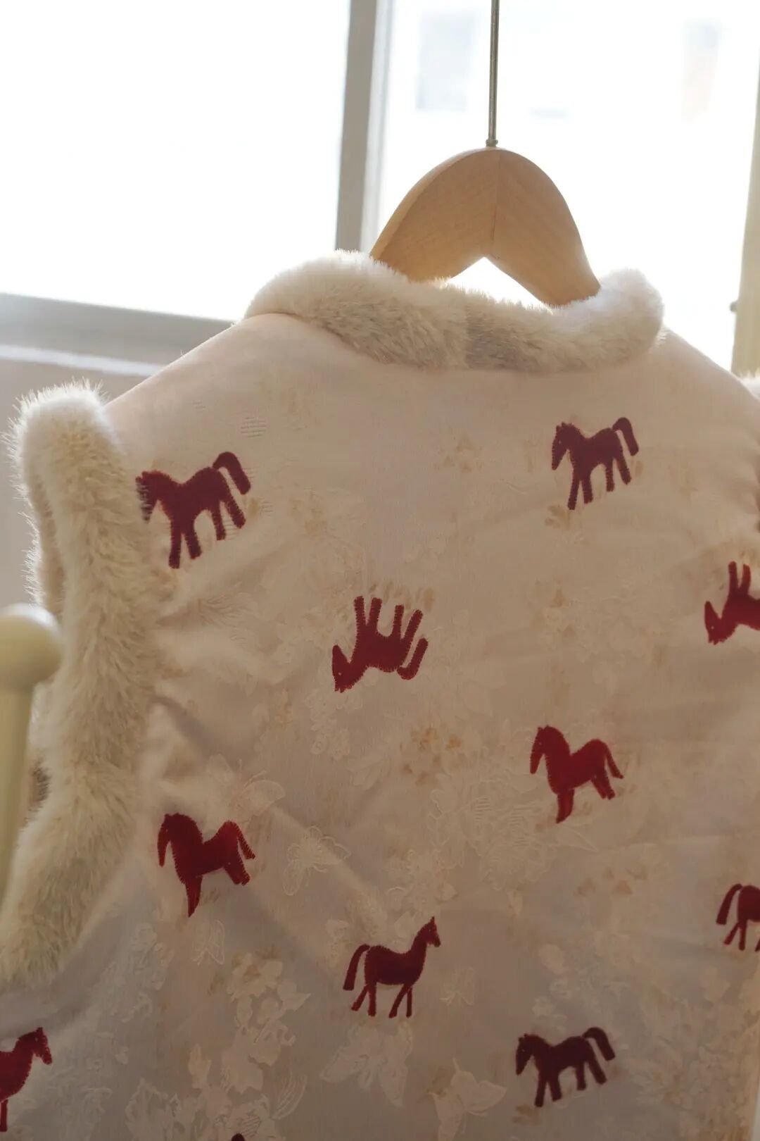 昨天穿它去奶奶家,老人家盯着直夸:“我姑娘穿这身真年轻,这小马活灵活现的,今年是马年,穿这个肯定顺顺利利。“