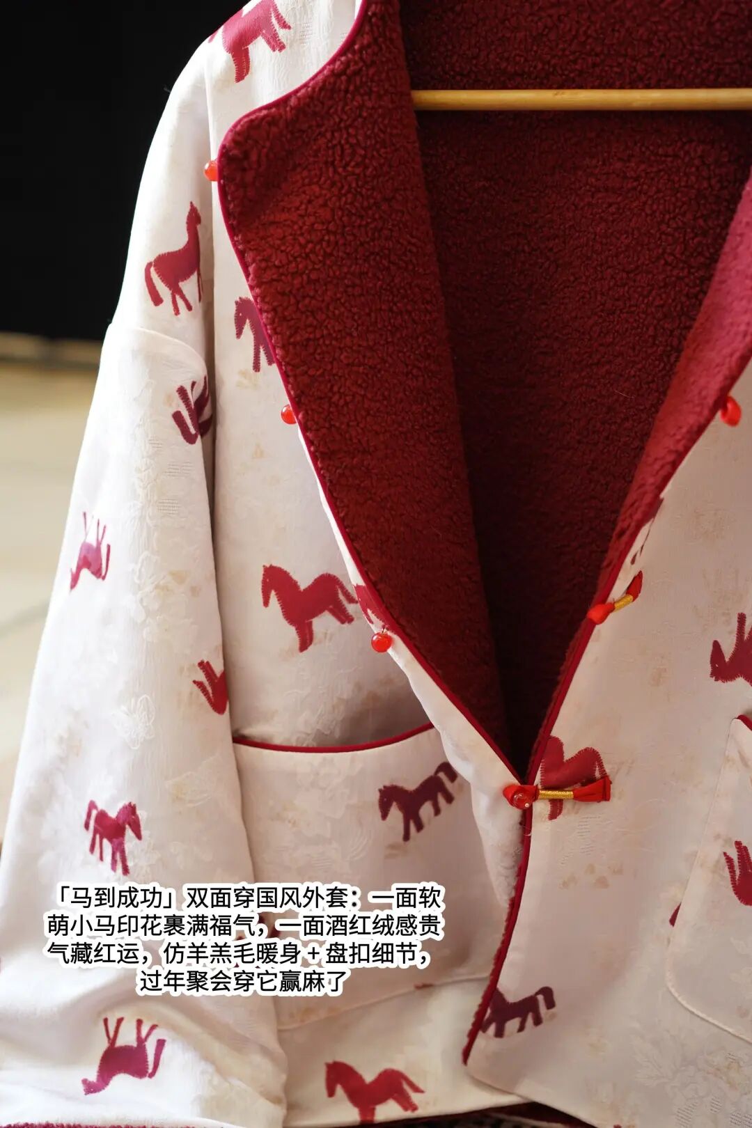 早上通勤穿新中式小马那一面,下班翻成红绒面赴约。