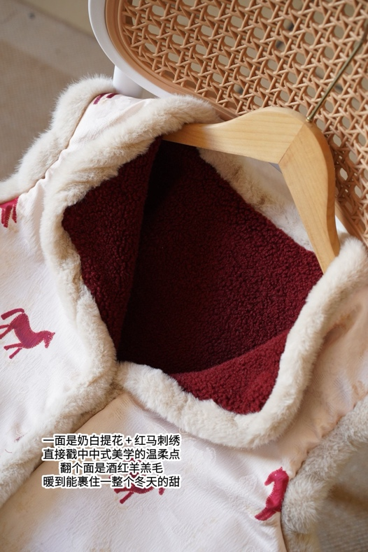 新中式与骐骥红融合、奶白提花与羊羔绒碰撞;一面是留白的中式甜贵,一面是红火的暖绒元气。