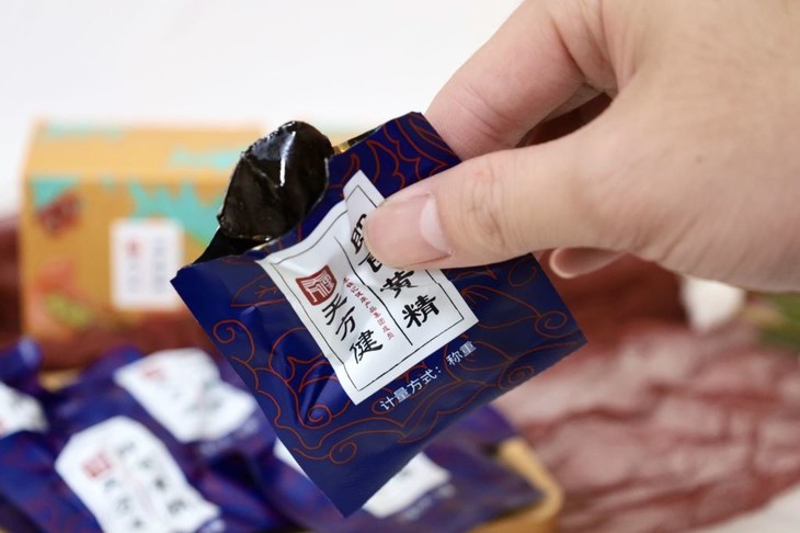 多道工序、精心炮制,最后得到的「即食黄精」颜色乌黑发亮,气味浓香;一口下去,肉质厚实,味甜中带点微苦,细腻无沙、无纤维感。