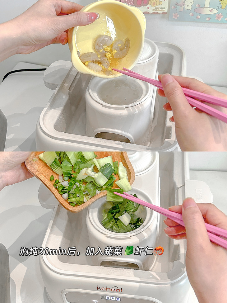 4、放入蔬菜碎和虾仁后,再炖10分钟即可。