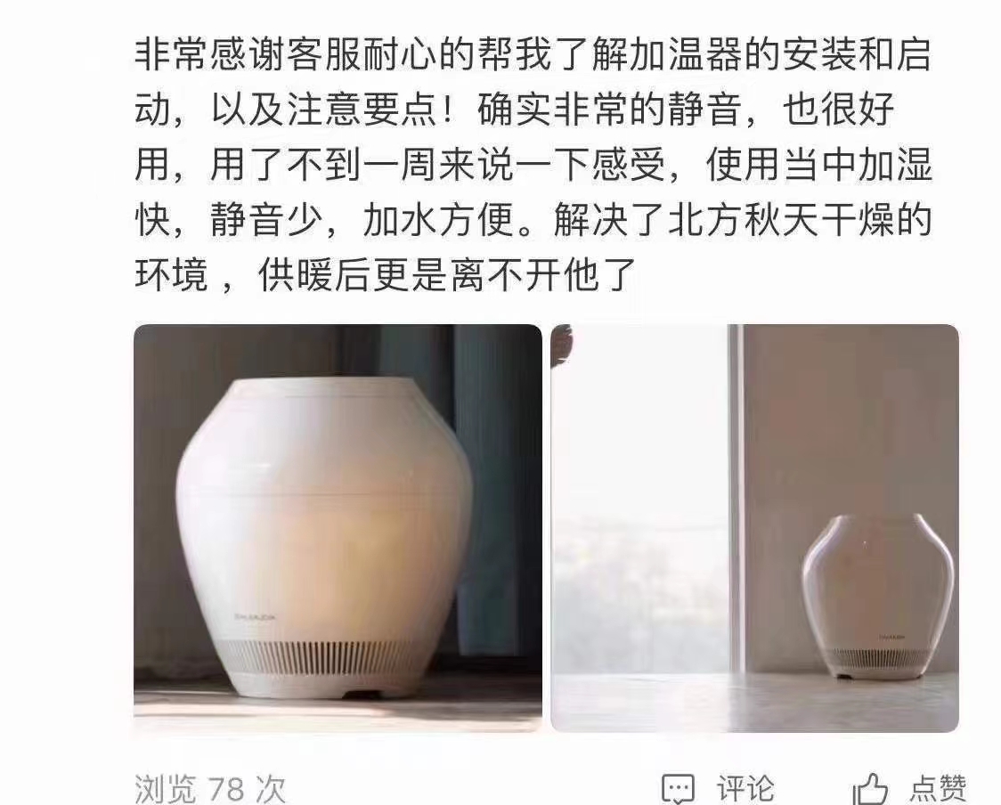 价格小贵,但毕竟安全和健康更贵,而且它还能代替空气净化器的一部分功能。秋冬季节,家里常备一台加湿器是提升幸福感的关键,分分钟省下不少面膜钱。