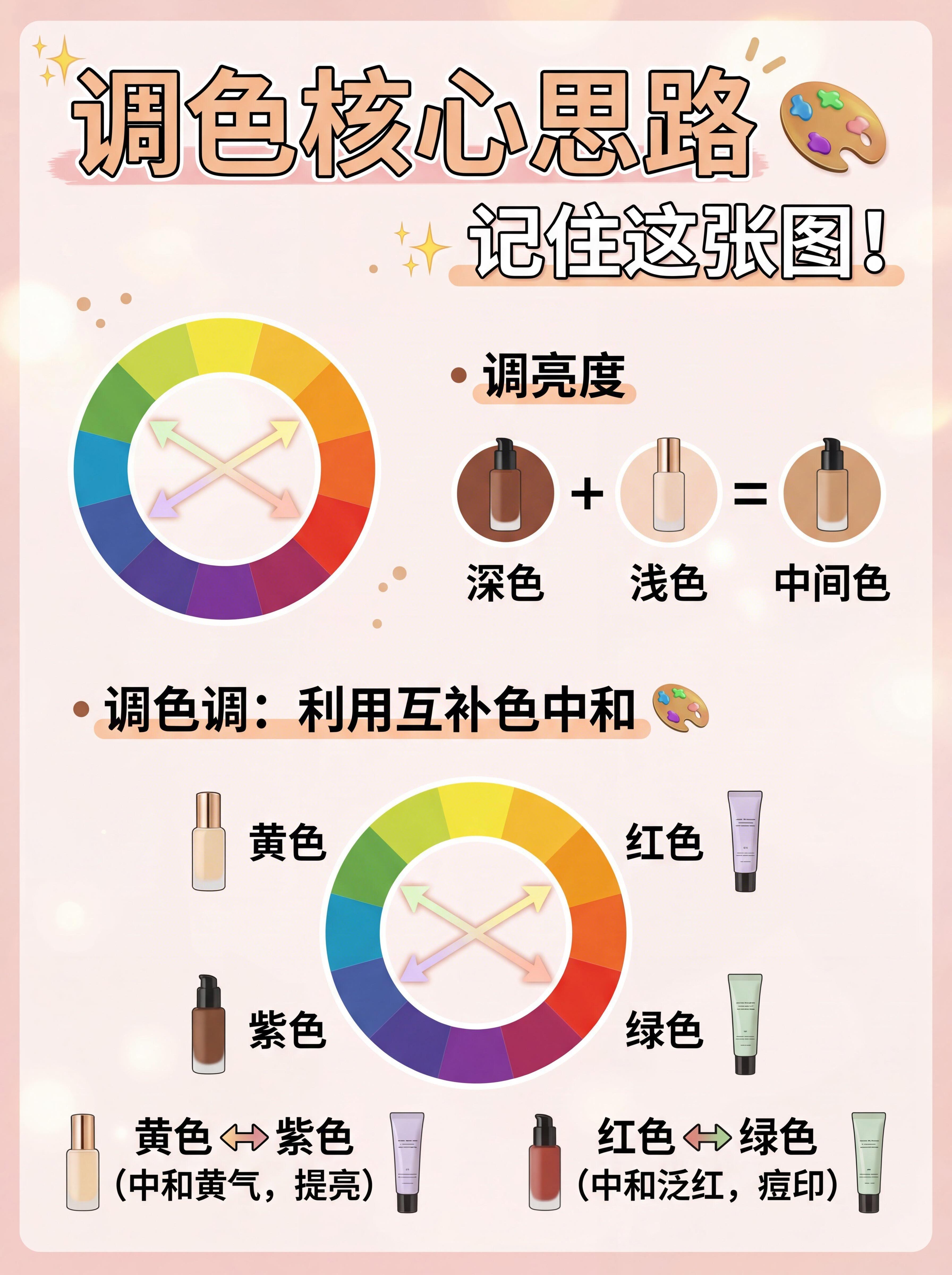 💡 调色小Tips • 一定要少量多次!慢慢加,直到调出最适合的颜色。 • 最好在自然光下看颜色,灯光下容易有色差。 • 用专门的调色板或者干净的手背,混合均匀再上脸。