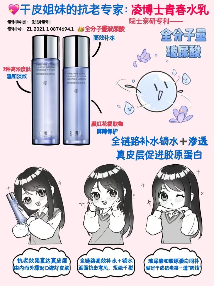 干皮想要冬季逆袭少女素颜肌,光是水乳面膜可不够,干皮皮脂腺分泌油脂少,屏障比较薄相对脆弱,不注意护肤思路脸还是干的起皮,最可怕的是眼角还起了小干纹瞬间老了10岁20➕的干皮姐妹护肤思路应该是️高效补水️温和抗老️屏障保护,想要做到这三点同时性价比又高破蛋最推荐是这款凌博士青春水乳🏼