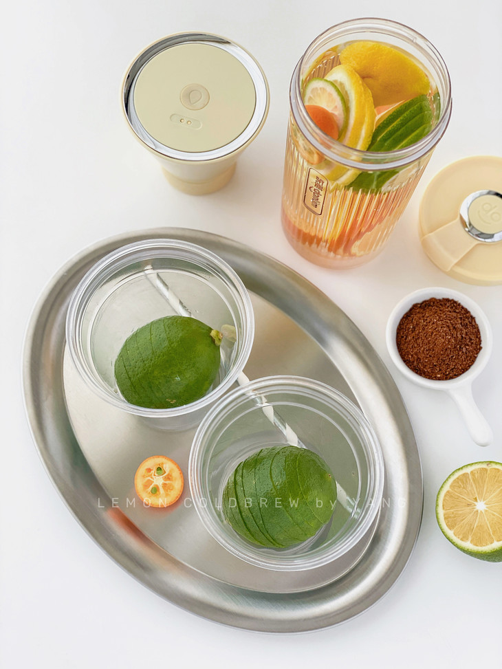 1.冷萃柠檬水、柠檬青柠、黄柠檬、橘子切片放入冷萃杯,柑橘风味儿水get!