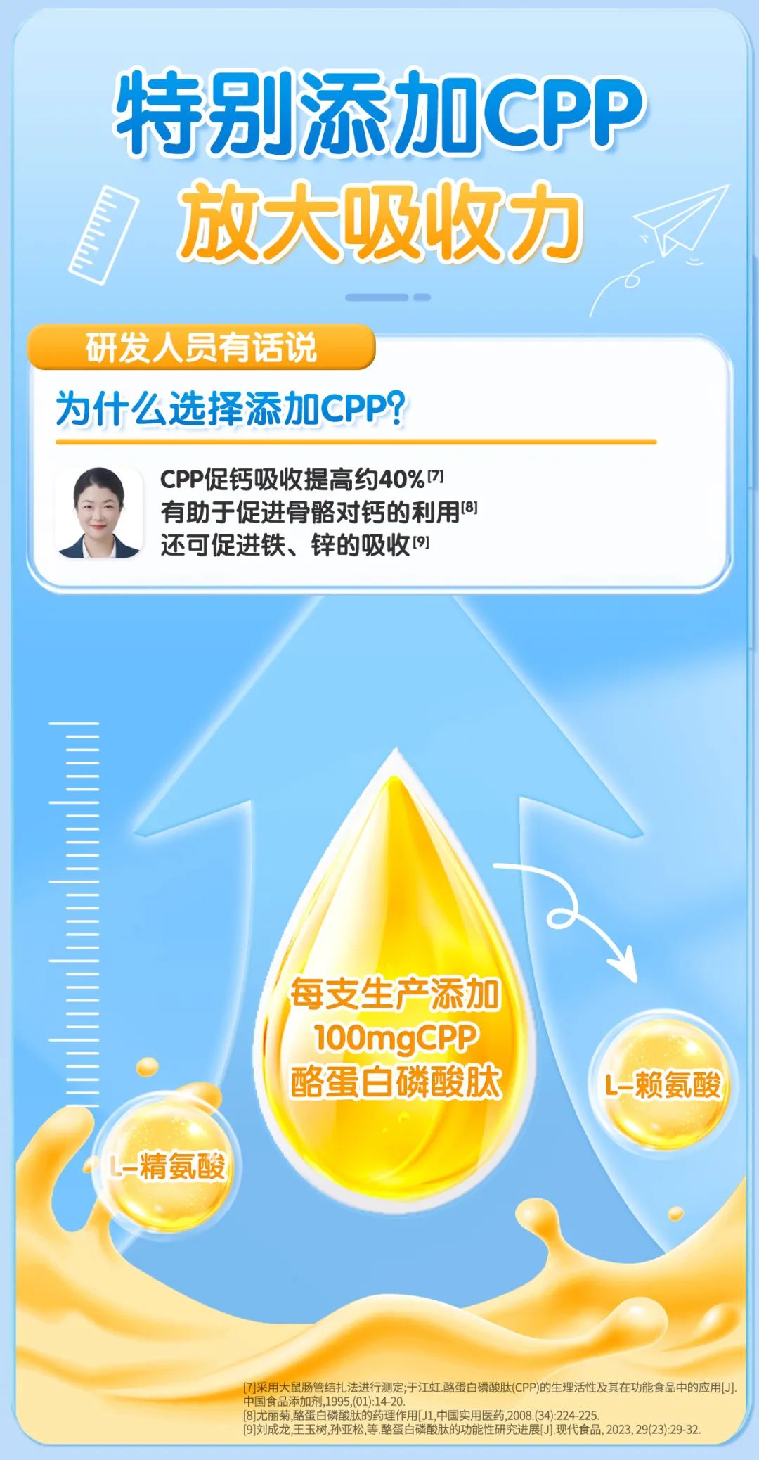 第二步:酪蛋白磷酸肽CPP+L-赖氨酸+L-精氨酸,促进钙等营养物质吸收;