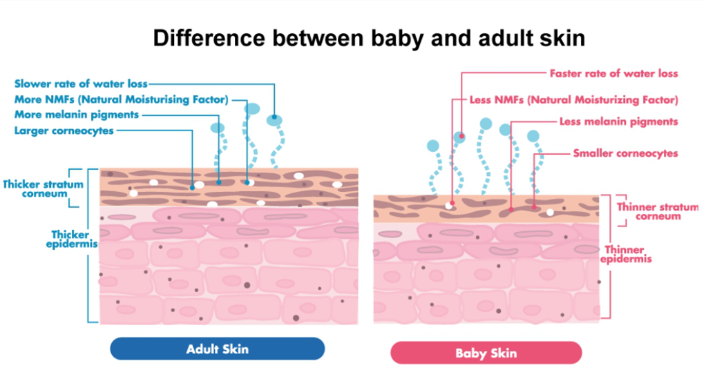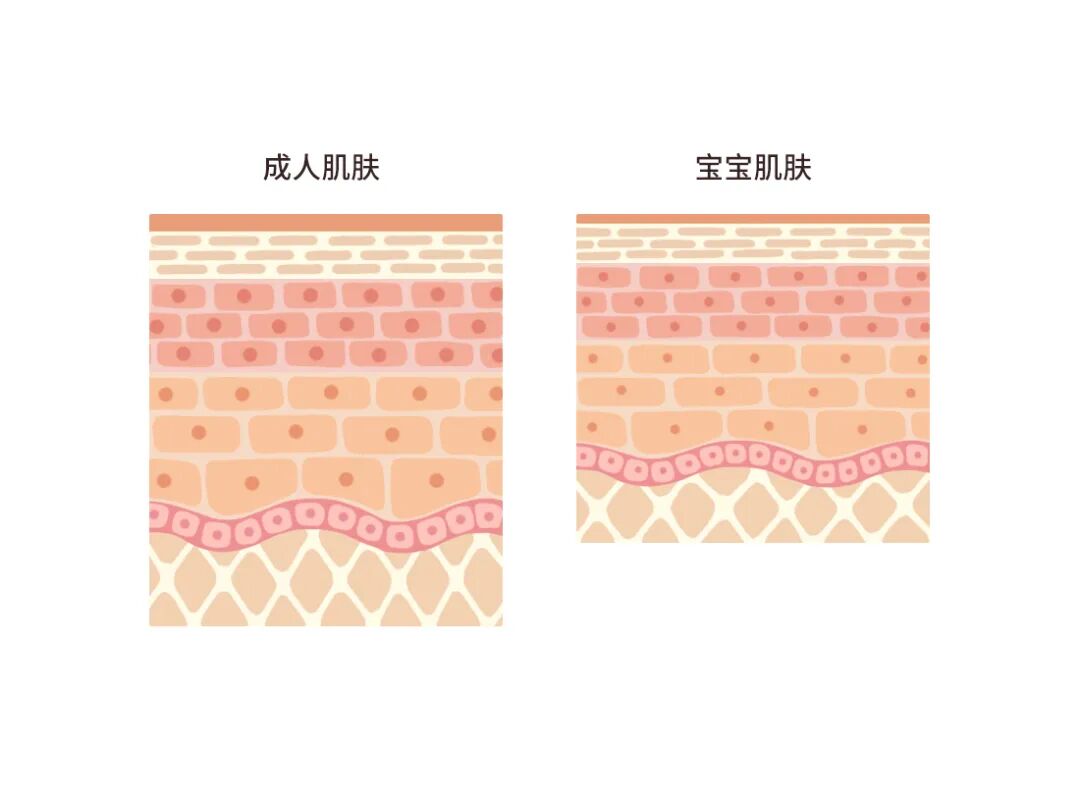 首先是「薄」。宝宝皮肤角质层的厚度比成人薄 30% 左右,表皮层比成人薄 20% ~ 30%,真皮层的总厚度也比成人低。[1]