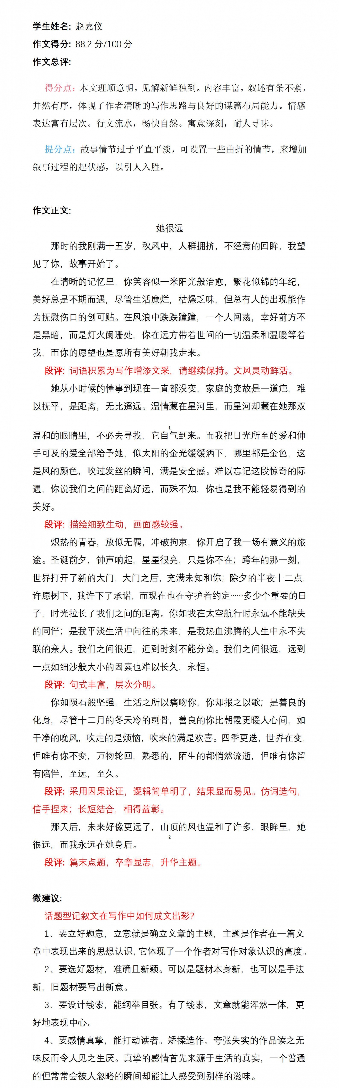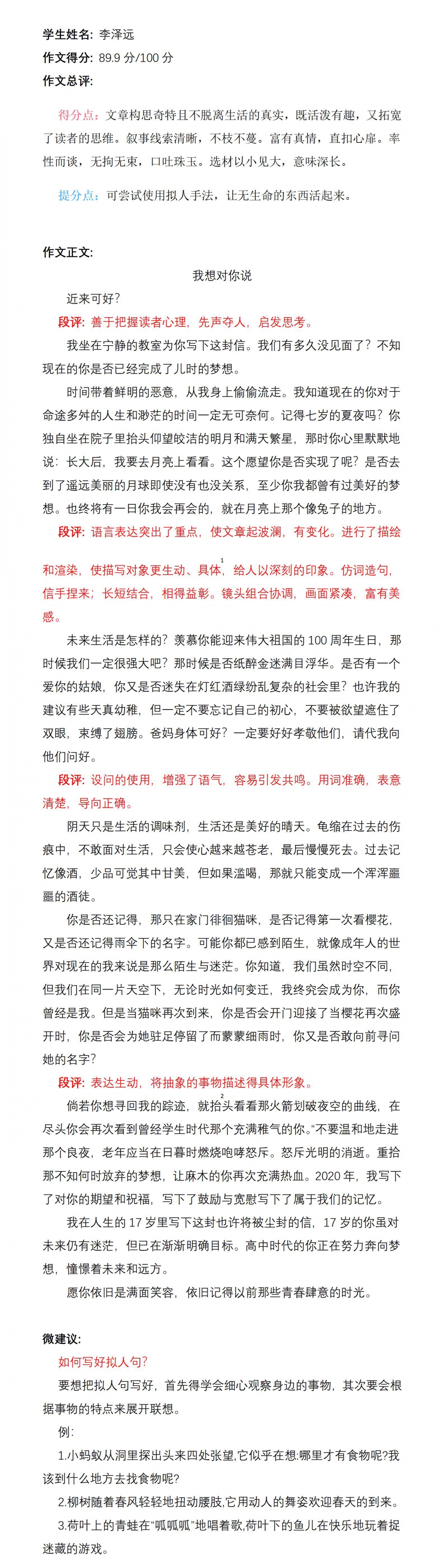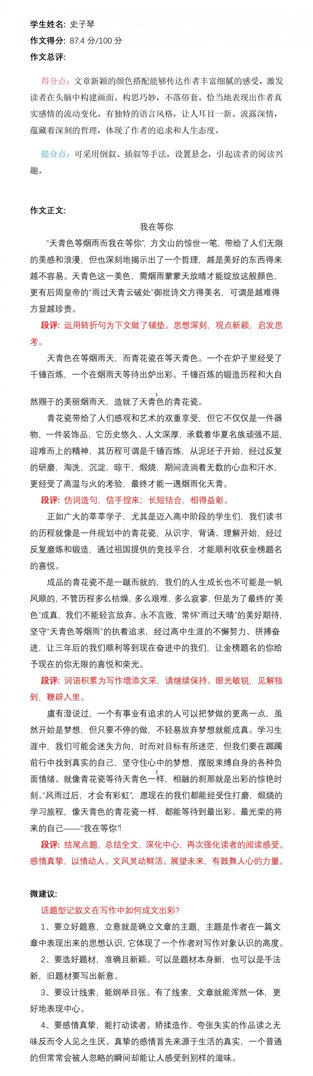 史子琴同学的《我在等你》一文,有诗意有生活有远方。饱蘸着中国风的词文,映射着青花瓷的“蝶变”,闪现着作者的真挚。子琴同学的诗书气质是含蓄的,脉脉的诗情总流淌在文字间,也植根在学习生活中,更飘荡于放眼未来的勤奋里!“书山有路勤为径”,子琴同学正在走向作文的成功之路!