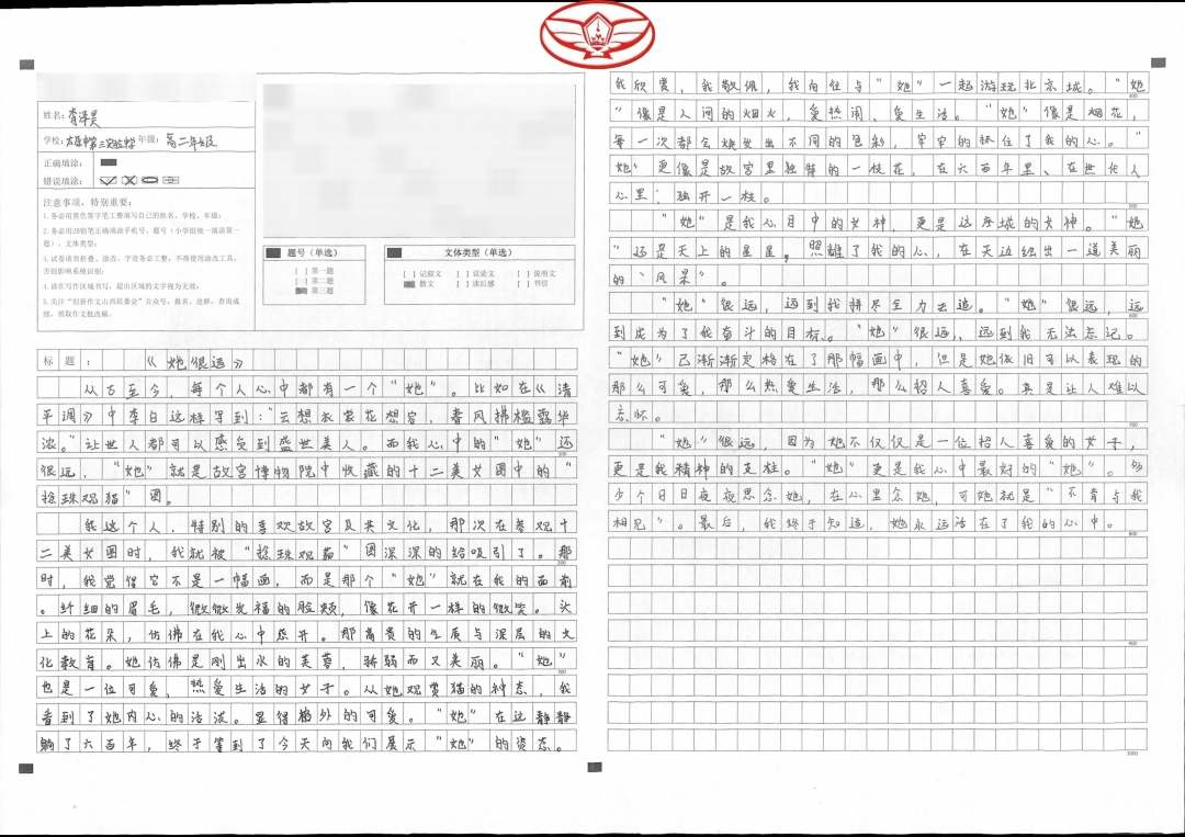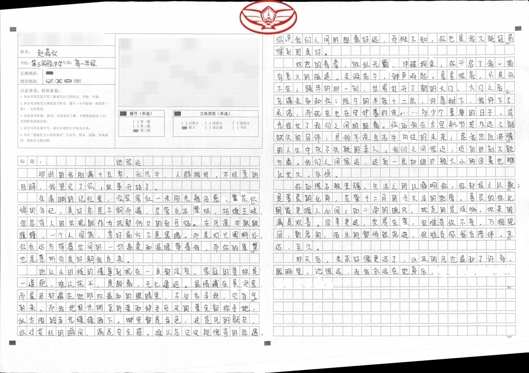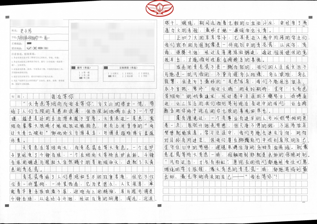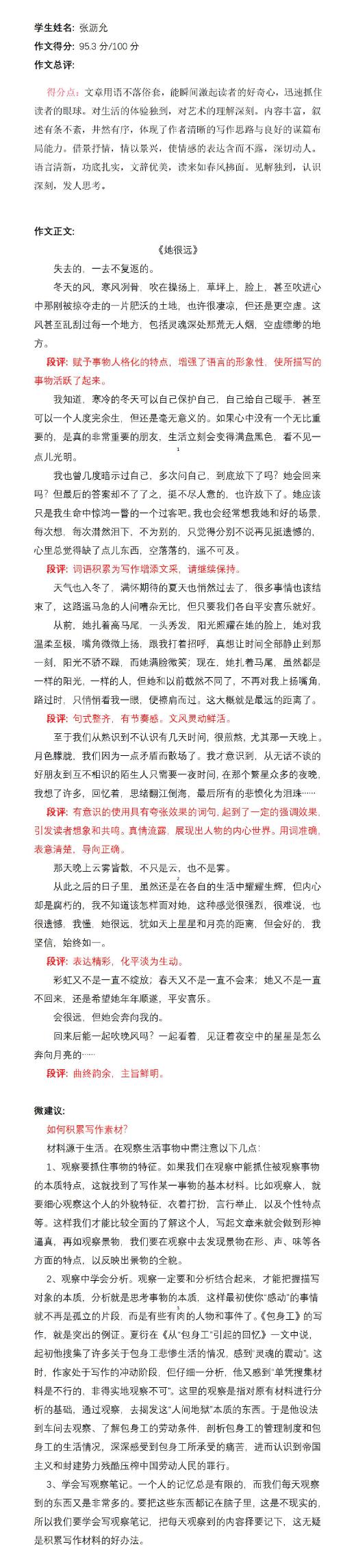 史子琴同学的《我在等你》一文,有诗意有生活有远方。饱蘸着中国风的词文,映射着青花瓷的“蝶变”,闪现着作者的真挚。子琴同学的诗书气质是含蓄的,脉脉的诗情总流淌在文字间,也植根在学习生活中,更飘荡于放眼未来的勤奋里!“书山有路勤为径”,子琴同学正在走向作文的成功之路!