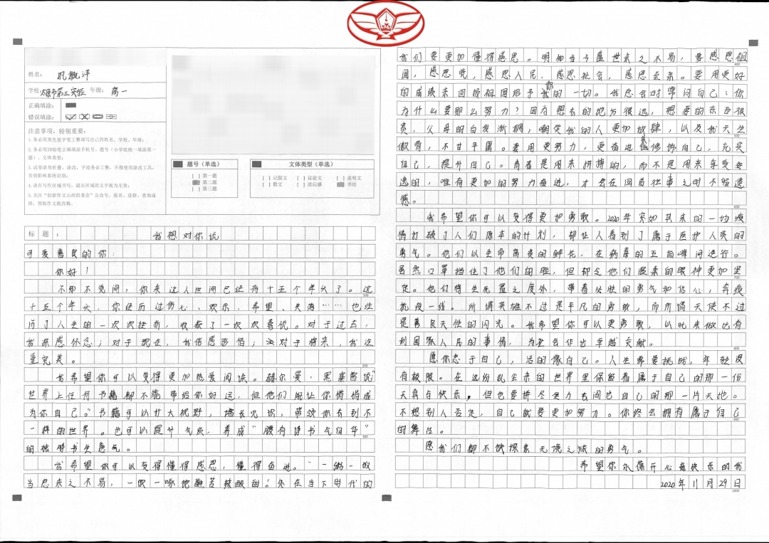 我通过了三个方面阐述了对自己的期望与目标:热爱阅读,感恩奋进,勇敢。特别是勇敢。2020年的新冠疫情让我留下了一生都无法磨灭的记忆,每个人都在尽自己最大的努力去为社会贡献,尽到自己的一份责任并想做的更多以此来盼望病毒早日逝去。他们的坚毅身影与坚定决心为整个社会树立了良好的榜样,更明白了国家的富强振兴,离不开每个人的日日奋斗。