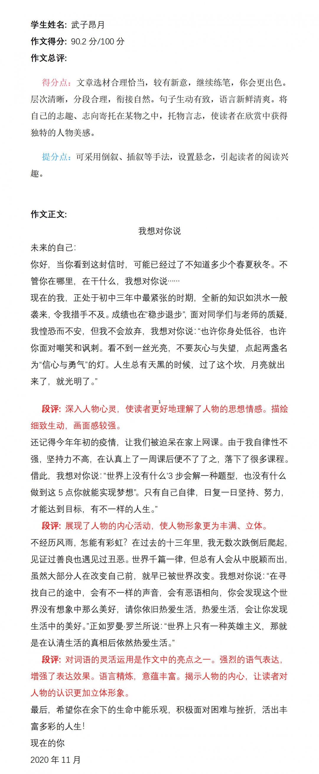 本文紧扣写作情境,写作身份与对象明晰。现在的"我"写给过去和未来的自己,儿时的困惑懵懂、现时的努力、未来的美好畅想都贯穿着对生活的热爱和对理想的执着追求。认清生活真相,坚定从容成长,是本文主旨,其中展现了小作者阳光自信的青春面貌。第二人称的运用,更凸显了独特的青春表达。
