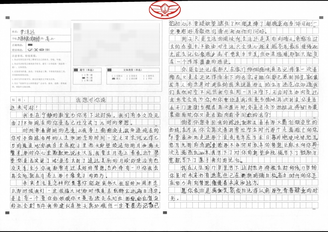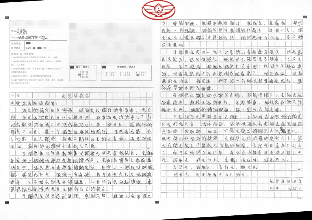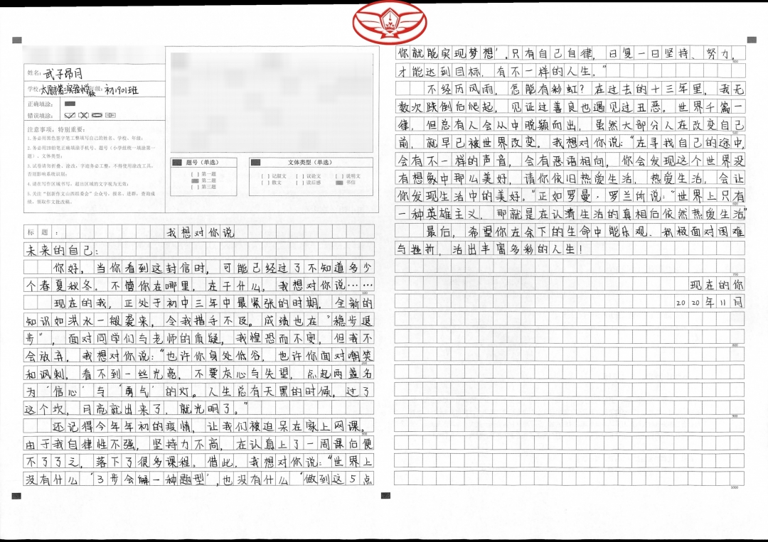 我用自己最真实的想法来写,想对自己说的话亦是对自己的期望,在成长中会遇到许多困难,也会遇到许多诱惑而走上弯路,想用这篇作文来换回初心,并警惕现在和未来的自己,把遗憾化为脚下的动力和未来的希望,通过自己的这番话能茁壮成长。