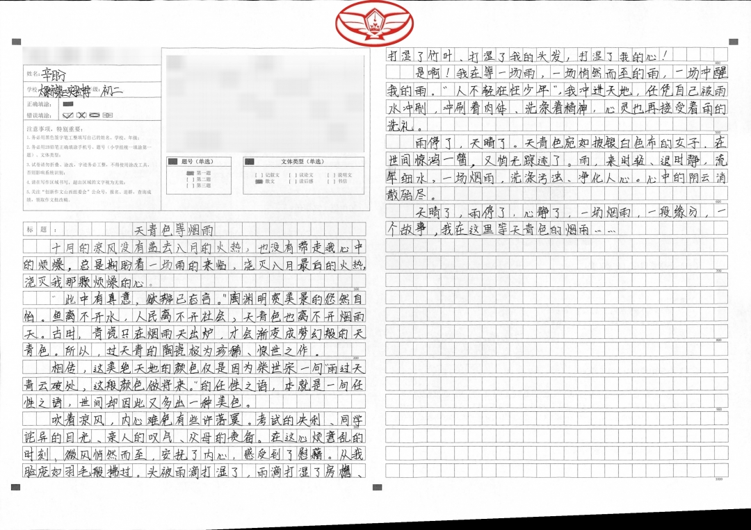 当我看到题目是天青色等烟雨时,看到天青色我就想起了曾经看过的有关于天青色的一个故事脑海中将想到的东西都捕捉住串成了这篇文章,恰好当时考试失利,都有些不如意,于是通过这篇文章来抒发了自己的情感。