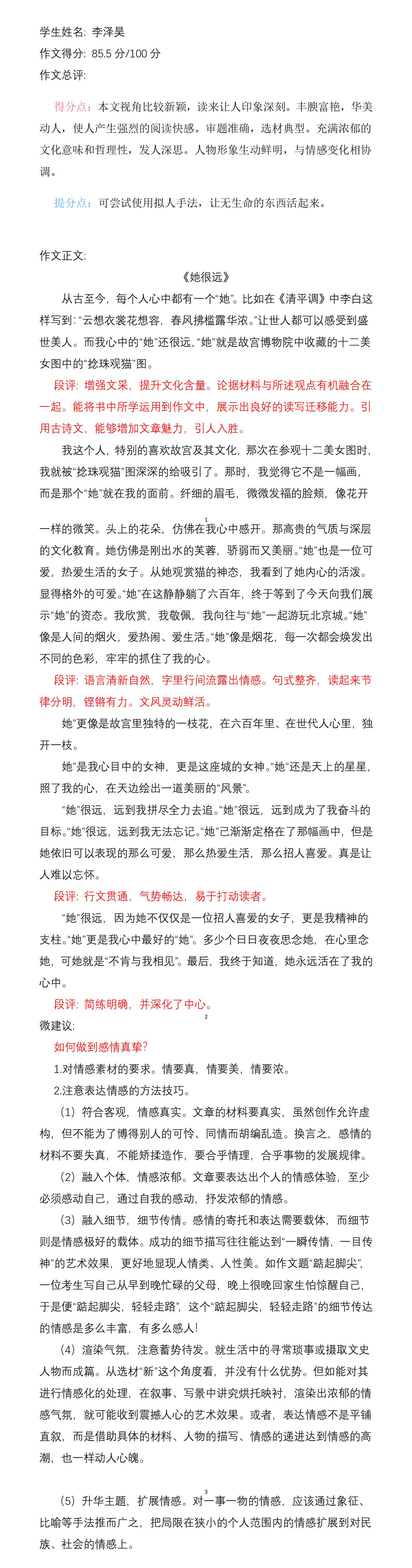 李泽昊同学的参赛作文《她很远》表达了一个中学生对故宫收藏的一幅画作《捻珠观猫图》的钟爱之情。这份钟爱源于国画超妙的表现技法、亲切的故事题材和融入人心的艺术境界。虽然说“她很远”,实际上传统书画的艺术感染力早已融入我们的血脉,静静地流淌在一代又一代中国人的灵魂深处。