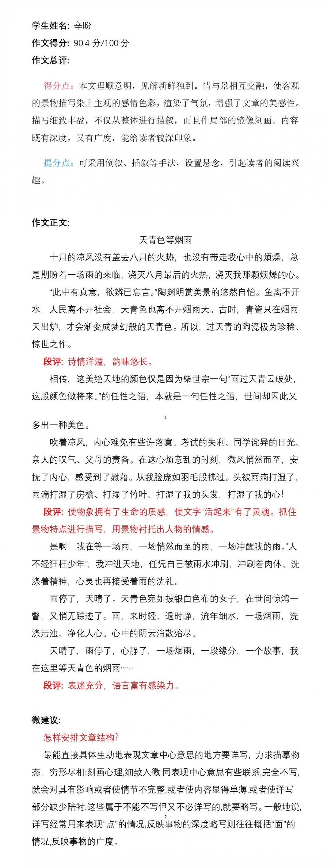 孩子,在天青色等待烟雨天的优美意境中,你能感悟到高中学习生涯对于人生的重要意义,说明你是一个非常内秀的孩子,正如你能静静地用笔墨作画一般,自有芳香和傲骨。“书山有路勤为径,学海无涯苦作舟。”希望你能继续保持这样优美的心静,伴你在高中的学习生涯中知苦不言苦、知难不怕难,勇于突破一个又一个难关,创造一个又一个奇迹,用三年的“烟雨天”培育出你独特的“天青色”,我和你都在等“你”。