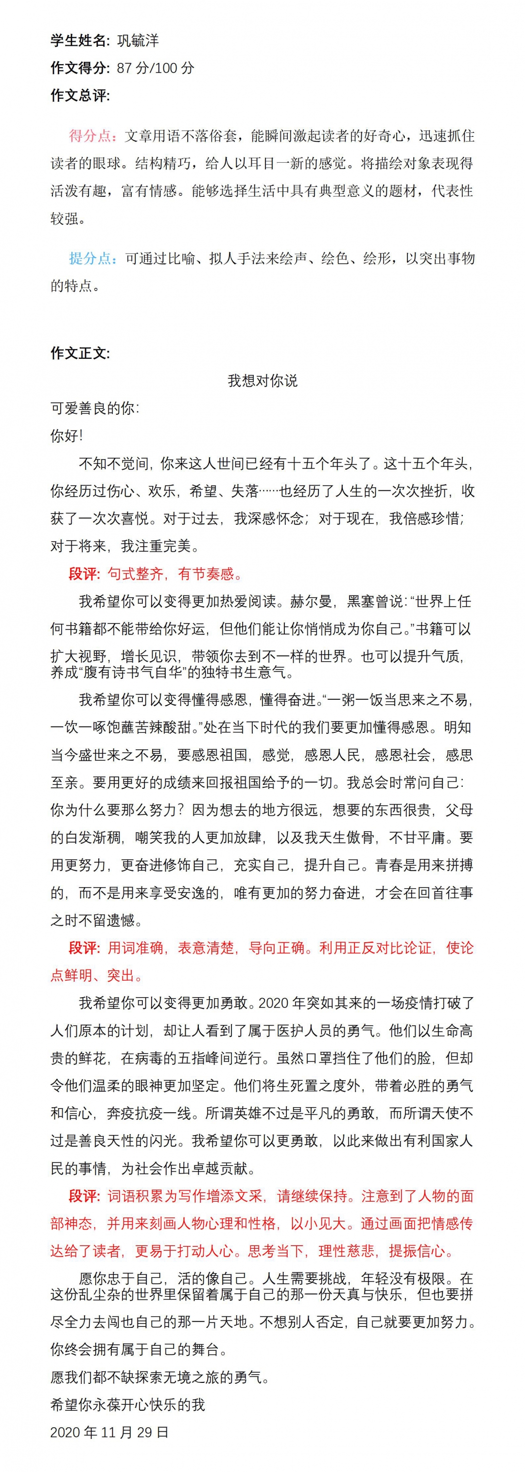 本文以对自己想说的话为线索,使用权文章连贯,流畅,衔接自然。事例叙述生动,具体,你用整篇都突出了作文的中心,表达了你对未来的情感,对未来的期待。