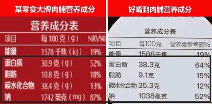 对比某大牌零食的肉脯,好嘴到肉脯蛋白质含量高,脂肪和碳水低,而钠含量更是相差巨大!哪个更健康吃货们自有判断。