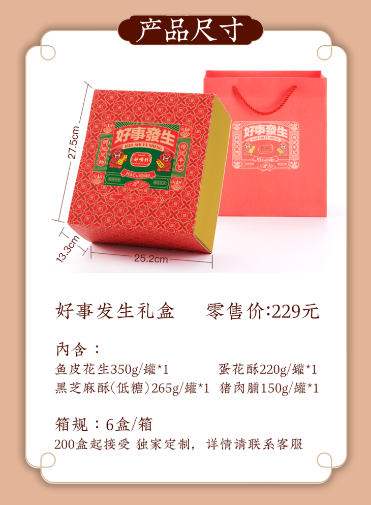 这款礼盒里面包含:原味鱼皮花生、蛋花酥、黑芝麻酥、原味猪肉脯。