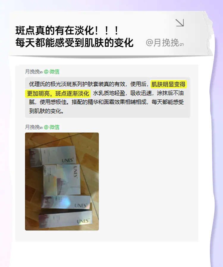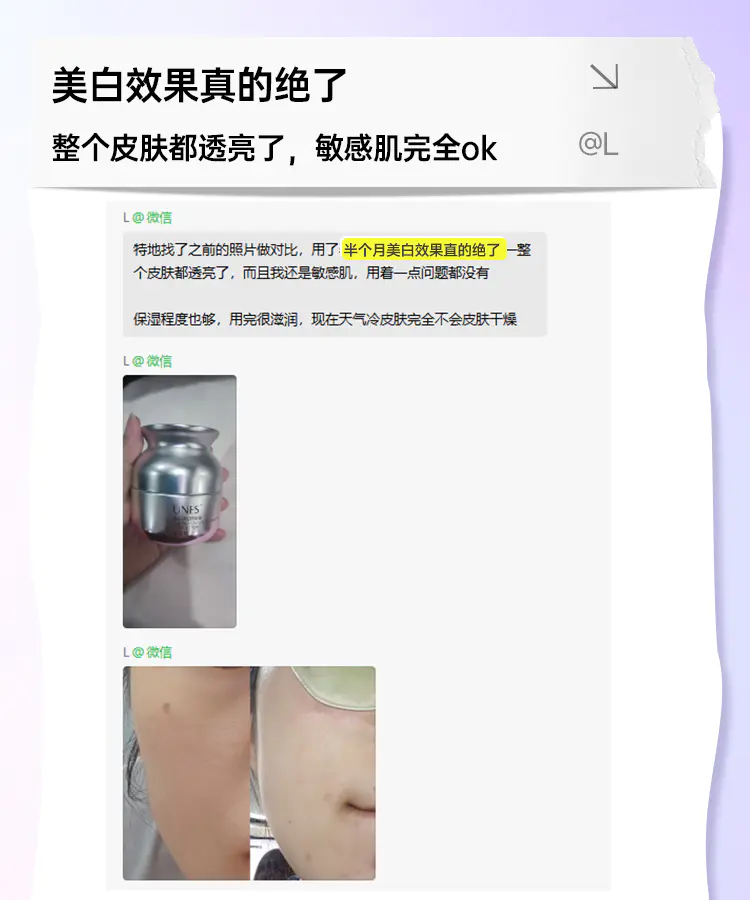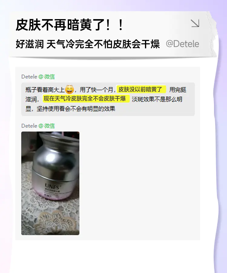 “美白效果明显”是反馈里出现最多的词语,这是因为我们在美白配方上下了狠功夫,而且是有国家美白祛斑特证的,真正有效果才会有这个证书;