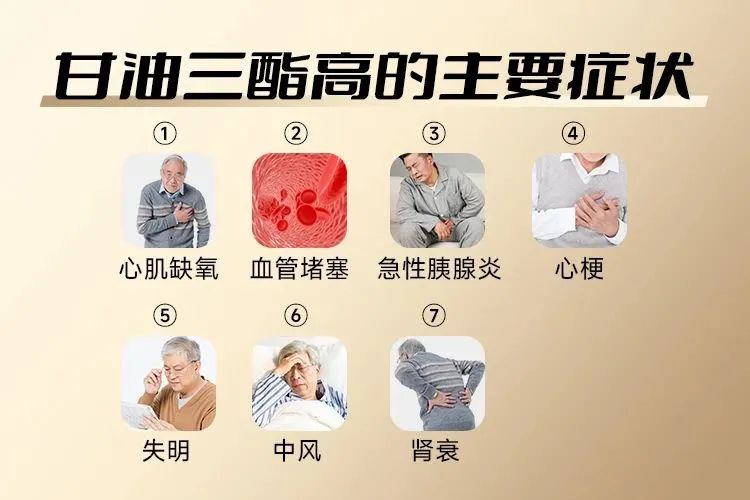 如果甘油三酯偏高发生在心脏,可引起冠心病、心梗;在大脑,可发生脑卒中、中风;发生在眼底,会导致视力下降、失明;如在肾脏,可引起肾衰;发生在下肢,则出现肢体血流不畅导致坏死。甘油三酯过量,血脂高,引发急性胰腺炎、心脑血管病等大问题。